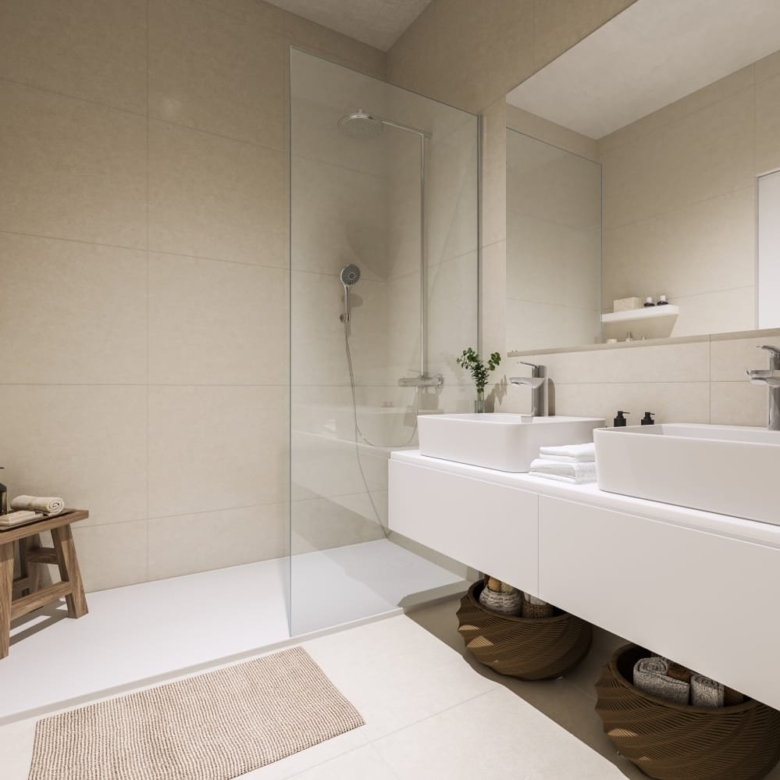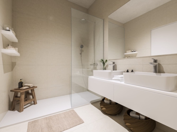 The development is made up of 5 three-storey blocks with: · Ground floor with a garden and possibility of a private pool · Middle floor · Penthouses with a solarium & terraces of 108m²