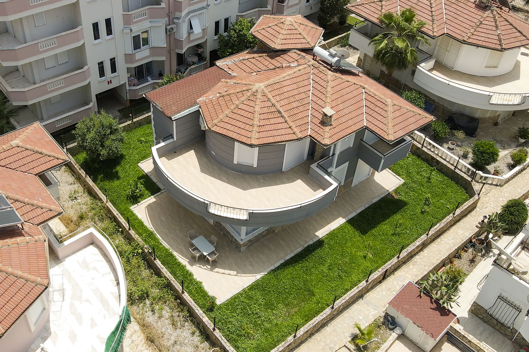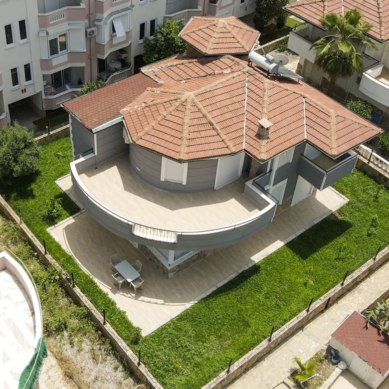 The villa’s architecture reflects modern Mediterranean influences, with clean lines, layered roof elements, and wide terraces. The tiled roof structure adds depth, while the light grey and beige exterior tones offer a contemporary and refined appearance.