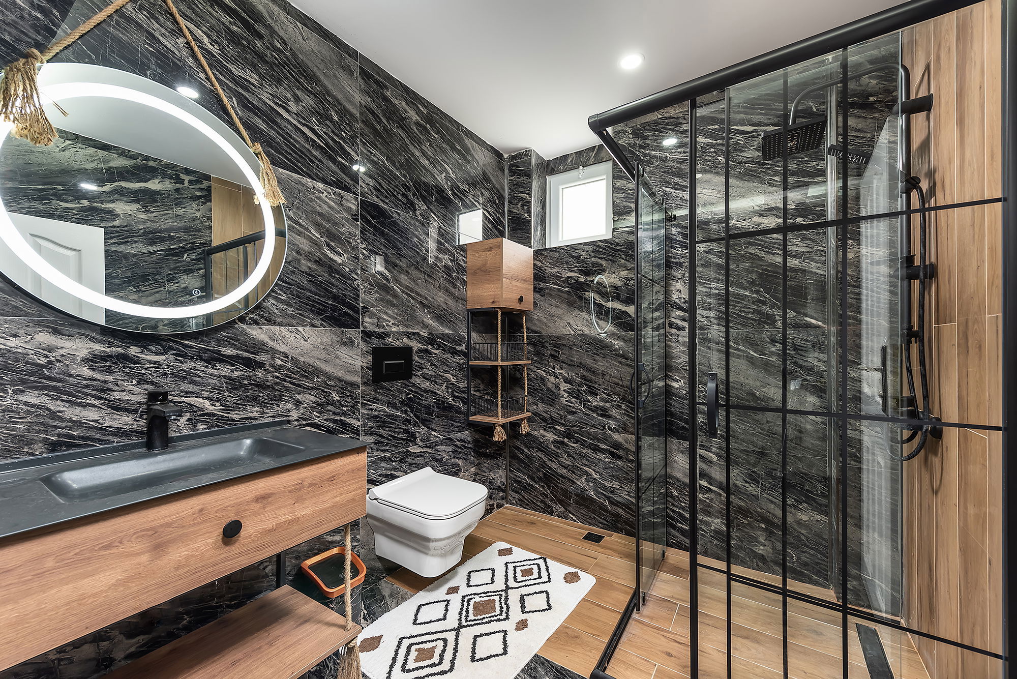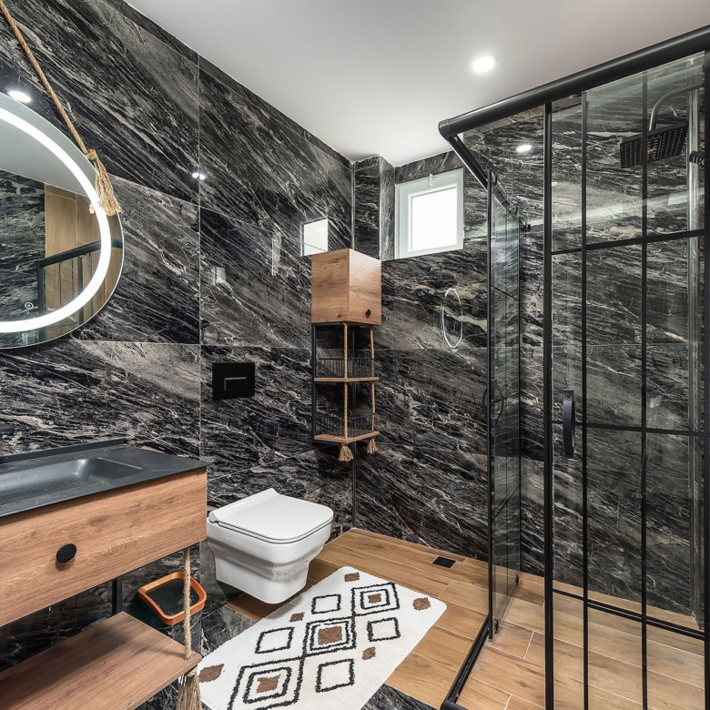 Wooden accents and black-framed details in select bathrooms