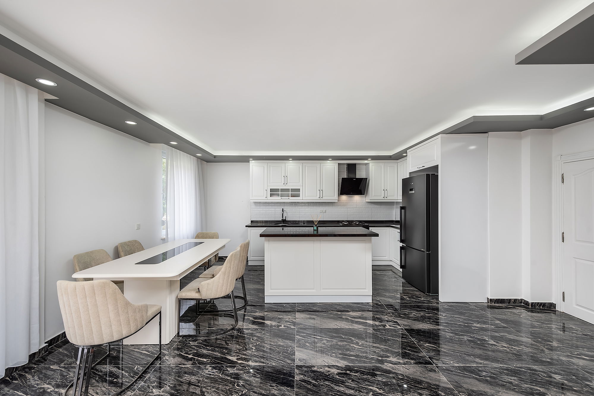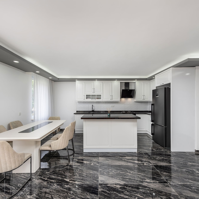 Dark marble-pattern ceramic tiles used throughout the house
