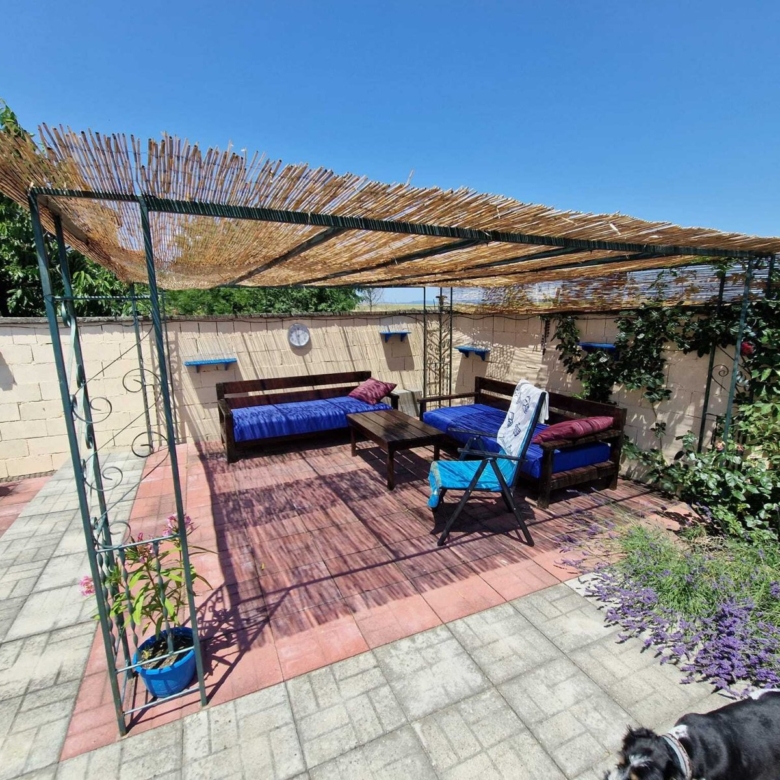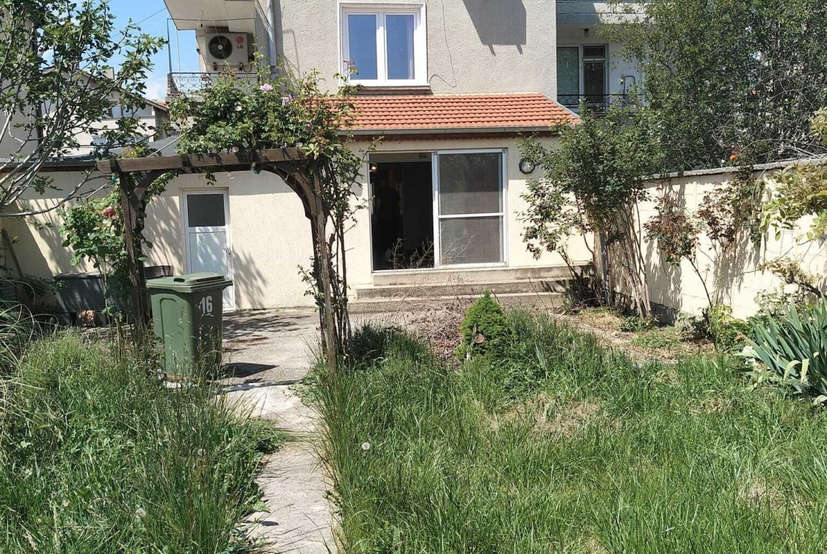 The garden area is private, featuring a large garage, a driveway, a traditional Bulgarian dining area, and a barbecue.