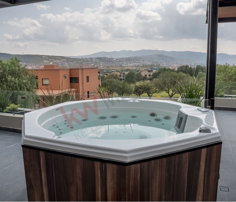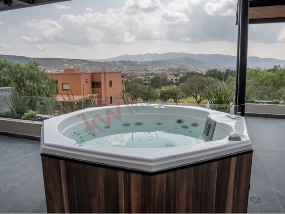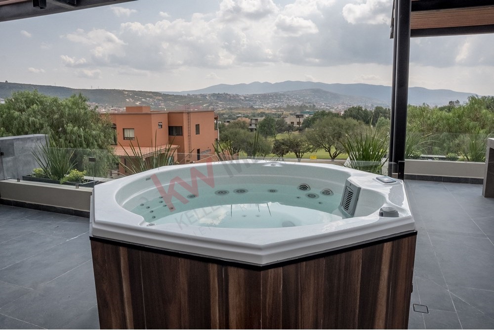 An elevated rooftop terrace, complete with jacuzzi, where you can unwind with a glass of wine 🍷 and gaze at the Parroquia de San Miguel Arcángel glowing on the horizon. The golf course stretches below, a silent invitation for tomorrow’s tee time. 🏌️♀️🌄
