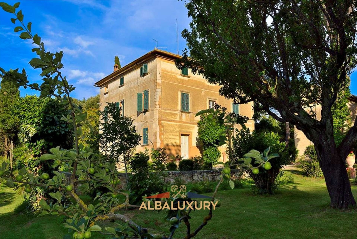 Immersed in the heart of Tuscany, this charming villa is a historical jewel chosen by the Etruscans for its enchanting location between the Valdichiana and the Val d’Orcia. After meticulous restoration, the 19th-century building now presents itself in all its splendour.^Inside, the frescoes decorating the rooms tell fascinating stories, with a spectacular view of Montepulciano and a panorama stretching as far as Lake Trasimeno and the Apennines.^On the ground floor, guests are welcomed into a large living room and a historic hall decorated with frescoes evoking the exploits of Napoleon’s campaigns. There is also a room with a private entrance from the garden, furnished with period furniture evoking an atmosphere of old-world elegance.^A charming stone staircase, framed by marbled arches, leads to the first floor.^Here, a suite with living room and fireplace offers a postcard view, while the corridor, protected by an antique gate, offers privacy and tranquillity.^Going further up, the second floor accommodates five rooms, each with its own tasteful furnishings and a breathtaking view of the surrounding countryside.The tastefully renovated stables and two annexes offer cosy flats with living room, kitchen and bathroom, ideal for a comfortable stay.^In the well-kept park, adorned with gazebos and flowers, is the ancient Church of St John the Baptist, a consecrated place that infuses an atmosphere of serenity and history, perfect for intimate ceremonies.^The Villa is the ideal retreat for those who wish to immerse themselves in the local culture, taste the region’s fine wines and discover historic villages such as Montepulciano and Pienza, turning every stay into a memorable experience.^,