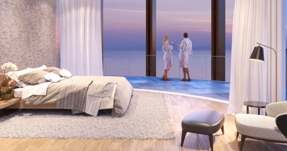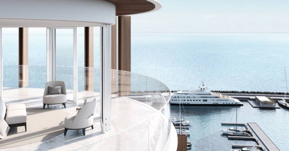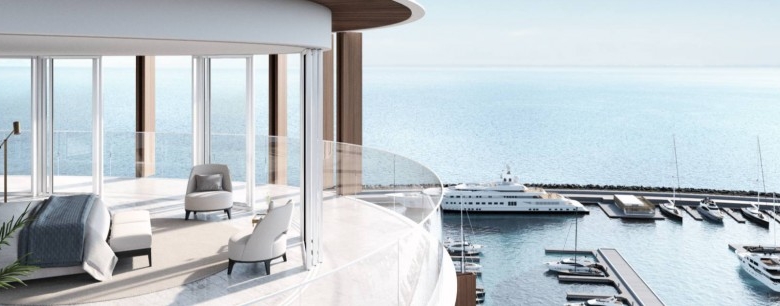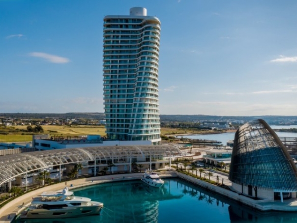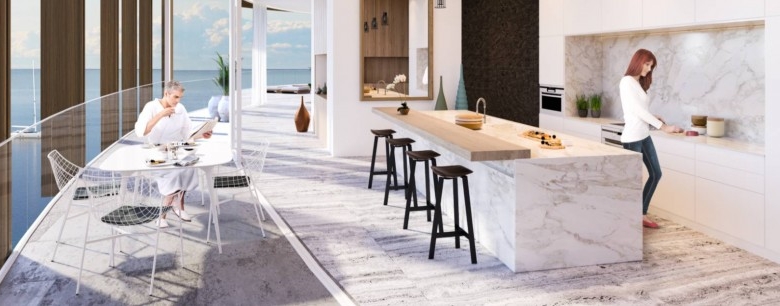 The East Tower is located at the commercial hub of the marina offering a vibrant and bustling environment for residents and guests. Its spacious lobby has an undulating sculptural ceiling soaring 12 meters above the floor and is surrounded by an all-glass exterior curtain wall with structural glass mullions. This allows an abundance of natural light to flow in and offers a direct view of the commercial area and Event Centre.