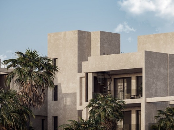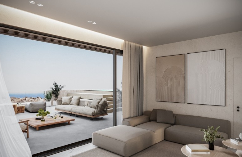 The Apartments are located in Protaras, in close proximity to the city of Paralimni, but also very close to the Kapparis area. One of the most popular regions of Protaras that is active throughout the year, providing dozens of amenities and entertainment options. The project is on a hill offering unobstructed sea views of Famagusta and Kapparis. The project consist of six blocks of apartments which provide a sense of privacy, comprising of 64 apartments with sea views or views of the communal swimming pool. They also include penthouses with a private pool and apartments with a private garden. Built in such a way as to convey the sense of a summer resort, the apartments stand out for their bohemian minimalist flair, their clear-cut lines and the quality of materials. It’s a project that accentuates design, while satisfying all contemporary lifestyle needs. The spacious common areas give a sense of openness to the residents, thus making it not only a holiday haven, but also the ideal permanent residence. Located between Paralimni and Kapparis, it gives the advantage to each resident to enjoy the magical sea view throughout the year. Apart from that, it offers quick access to the amenities located in the city of Paralimni, while being only a few minutes away from some of the finest beaches in Cyprus, located in Protaras Completion-September 2026