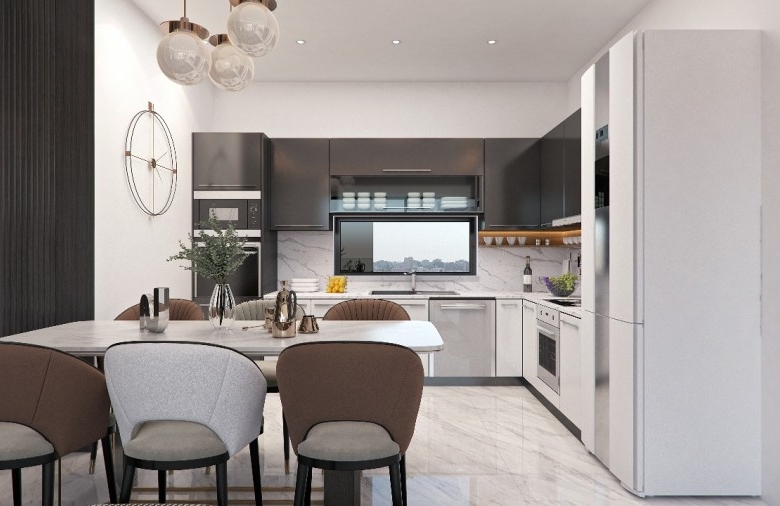 The two-bedroom apartment offers a seamless blend of modern design and functionality, featuring spacious layouts, floor-to-ceiling windows, and high-quality finishing materials. The interiors are thoughtfully designed with large-format elegant tiles, built-in kitchens and wardrobes, and decorative false ceilings with subtle lighting for a refined ambiance. Bathrooms are equipped with electric towel rails, while the open-plan dining and living areas enhance the sense of space and comfort. Residents can also enjoy private balconies, creating a perfect extension of their living area, all within a secure, amenity-rich complex that sets a new standard for contemporary urban living.