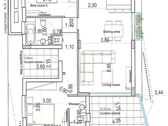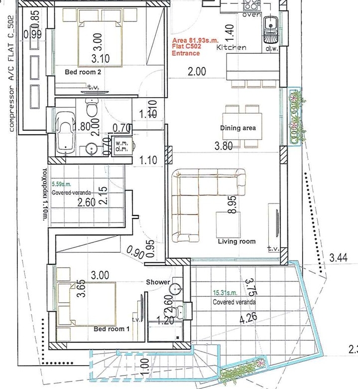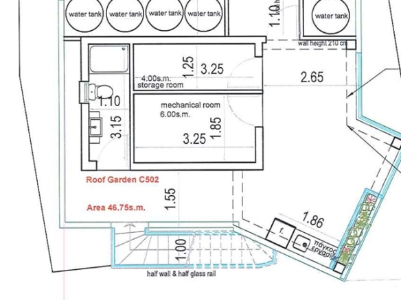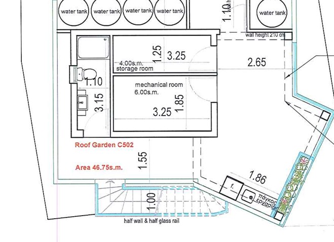 The project boasts eleven apartments in total 3 one bedroom & one bathroom on the first floor and two bedroom & 8 two bathroom apartments on rest of the floors- all with spacious and contemporary living areas. There are three apartments per storey – ensuring optimum privacy for potential buyers. The five floor apartments benefit from individual private and luxury roof-gardens with amazing views of the lovely Neighborhood. Each apartment has one parking bay and a storage room on the ground level.The lovely residential neighborhood is quiet and family orientated surrounded by large luxury houses and residential properties. The project is very near to supermarkets, private schools such as the American Academy and with immediate access to highways to Nicosia, Limassol, Paphos and Ammoxostos.This unit has a roof garden area of 47 square meters with 2 rooms and a bathroom. Delivery-December 2026
