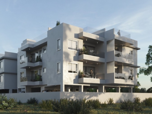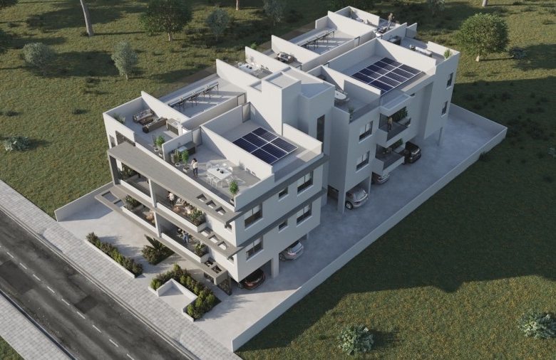 This contemporary residential development is located in Oroklini, Larnaca, just 2 kilometers from the beach and 8 kilometers from the city center. Comprising 14 apartments—eight one-bedroom and six two-bedroom units—the complex offers modern living spaces with open-plan kitchens, cozy bedrooms, and spacious verandas. Select second-floor apartments feature private roof gardens, providing additional outdoor space. Each unit includes a covered parking space and a storage room on the ground floor. The building is equipped with an elevator and boasts high-quality finishes such as marble flooring in the lobby, granite kitchen countertops, and double-glazed thermal aluminum windows. With an energy efficiency rating of A+, the project is designed for comfortable and sustainable living. Construction is expected to begin in early 2025, with completion anticipated by summer 2026.