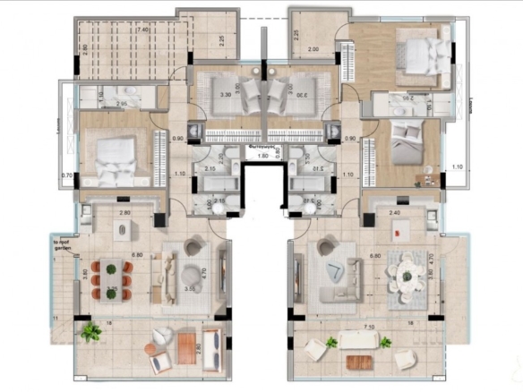 This luxurious 3-bedroom, 4-bathroom apartment offers a perfect blend of elegance and functionality, featuring an Energy Efficiency A certification for sustainability and cost savings. The bedrooms include its own en-suite bathroom for privacy, complemented by a stylish guest bathroom. The apartment boasts large covered verandas and a 70 m² private roof garden, ideal for outdoor living, entertaining, or relaxing while enjoying panoramic views. High-quality double-glazing thermal aluminum windows and doors provide excellent insulation, while additional features include a concealed laundry station, linen closet, covered parking, and a dedicated storage room. Located in a serene residential neighborhood, it is within walking distance of Larnaca Metropolis Mall, supermarkets, bakeries, gyms, and hospitals, and offers convenient access to major highways. A nearby park further enhances its appeal, creating a harmonious balance of comfort, luxury, and convenience