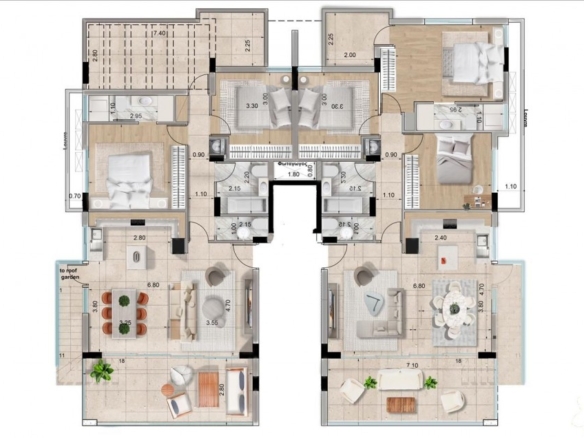 This modern 2-bedroom, 4-bathroom apartment is designed to offer both luxury and functionality, featuring an Energy Efficiency A certification for sustainability and reduced energy costs. Each bedroom includes its own en-suite bathroom for privacy, complemented by a stylish common bathroom and a guest bathroom for added convenience. The apartment boasts large covered verandas for outdoor relaxation, double-glazing thermal aluminum windows and doors for superior insulation and noise reduction, and a concealed laundry station for practicality. Additional features include a linen closet, covered parking, and a private storage room. Situated in a quiet residential area, it is within walking distance to Larnaca Metropolis Mall, supermarkets, bakeries, gyms, and hospitals, and offers easy access to major highways. A nearby park adds to its charm, making it an ideal choice for modern living with all the comforts and amenities close at hand.