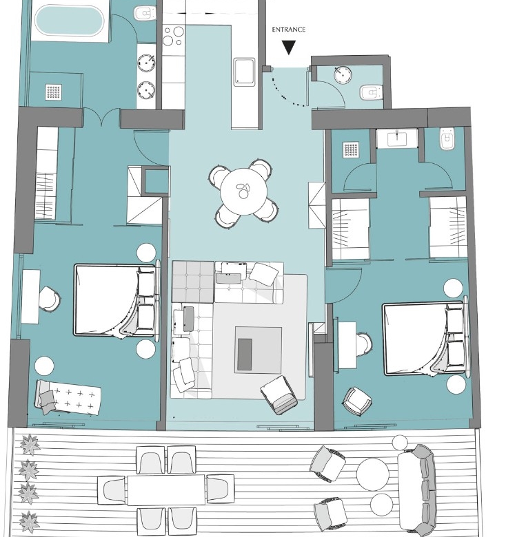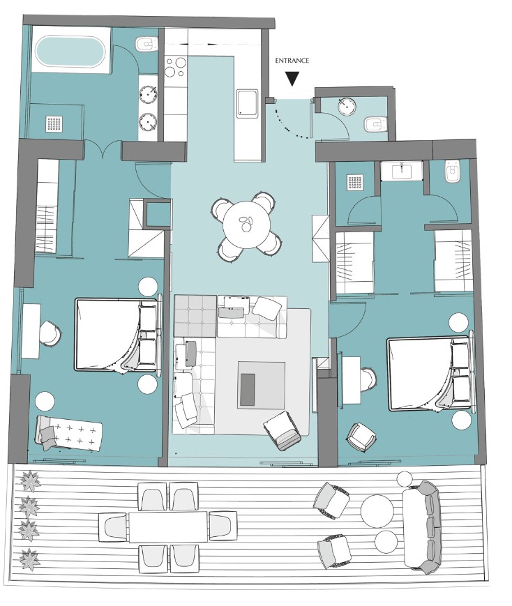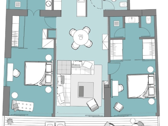 The sunlight that enters through all the areas provides the feeling of cosiness and comfort, as soon as you enter this two bedroom residence. The elegant interior of this residence captures the essence of contemporary Mediterranean living, offering to its residents a secluded place where they can indulge in a truly unique living experience. The Two Bedroom Residence consists of 2 bedrooms, with en-suite bathroom or shower, an open plan kitchen and living room and guests WC. The master bedroom features a walk-in closet.