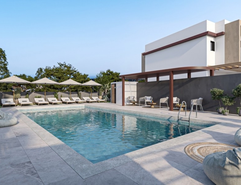 A modern residential multifamily gated community situated in the heart of Parekklisia, a charming village located in the Limassol district of Cyprus. The Project, developed to the highest standards, boasts 45 stunning Maisonettes and 4 apartments of 1 bedroom each. Each Maisonette is designed as a two-story semi-detached unit, with a mix of 2 and 3 bedroom options available, built using only the finest quality materials and high – end finishes. The units have been thoughtfully designed to provide comfort and convenience, with each Maisonette including a private parking space and a private back yard. Some of the units have also been provisioned to include a private swimming pool. The project has been designed with a signature style that is showcased in the sleek and modern design of these Maisonettes. Each unit has a spacious open-concept layout with-custom made kitchen cabinets, built-in wardrobes in each bedroom, large double-glazed windows, covered verandas, guest W/ C and much more.The gated community project provides maximum privacy and security to its residents with a controlled gate access. The community is equipped with a large common landscaped courtyard featuring communal swimming pool,  a playground facility and sitting area for kids to enjoy, making it an ideal residential option for families. Delivery – December 2026