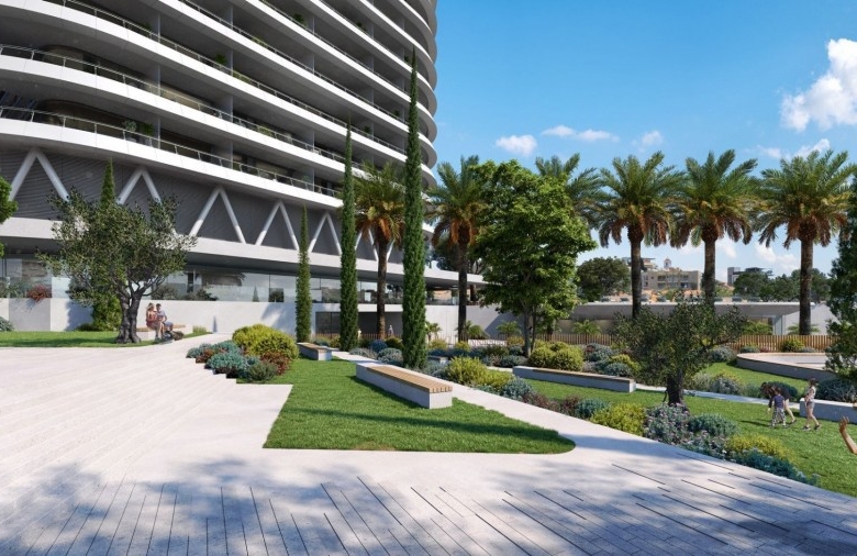 Located in one of the best areas of Limassol, 200m from the sea, a luxurious high-rise residential project spanning vertically over 25 storeys. Set to be completed in 2025, the project is designed to resemble a floating structure above the waterfront, welcoming those who long to reside in a fully integrated urban development with style and highest specifications. Using lightness, transparency and luminosity as an architectural language, attempting to blend sky, sea, and ground seamlessly. It uses reinforced concrete structure, bricks for internal walls, glass, wood, and introduces luscious landscaped areas both with its gardens on the ground floor as well as the 16th level Executive floor/Sky Garden/Restaurant, to enhance the tranquil atmosphere created for the residents. The vast variety of communal features that have been accommodated within the design in order to serve the residents only reinforce this sense of luxury.The linearity in the geometry of the square, which spans over 1600m2 directs the visitors towards the building while accentuating its connectivity to the seafront. Upon entering into the 3000m2 private gardens, the residents are surrounded by the synergy of the different elements; the water and rich landscaping along with private and protected recreational space. The elevated, external 25-meter swimming pool, acts as a focal point around which the private spaces develop, working as a continuation of the square’s geometries, creating a connection between the lower entrance levels of the development. The large indoor heated swimming pool adds up to the amenities of the project.The Wellness & Spa zones that are directly adjacent to the main Swimming pool area, encompass numerous amenities for the residents to enjoy.An absolutely unique feature is it comprises two lounge/barbeque areas at each residential floor (except the penthouses) with centralized extraction system and all facilities. All 65 apartments and 2 magnificent penthouses of the project were carefully designed in order to enjoy uninterrupted sea views, providing that sought-after luxury island lifestyle. The internal finishes are all hand-selected as part of exclusive finishes encompassed within the project. Natural marbles and granites, top niche wood flooring and Italian kitchen and wardrobes dress the internal of the properties. The three level penthouses located on the top floors of the building, offer exclusive 360 views of the city, private roof gardens as well as private infinity swimming pools.Combining a wide range of luxury features and amenities, becoming a flagship to the island, and the place to live. The apartments offer the ultimate in calm, elegance and simplicity of leading contemporary design, while providing spectacular views across the sea and Limassol skyline. For this unit covered veranda includes covered garden 9.3 sq.m.