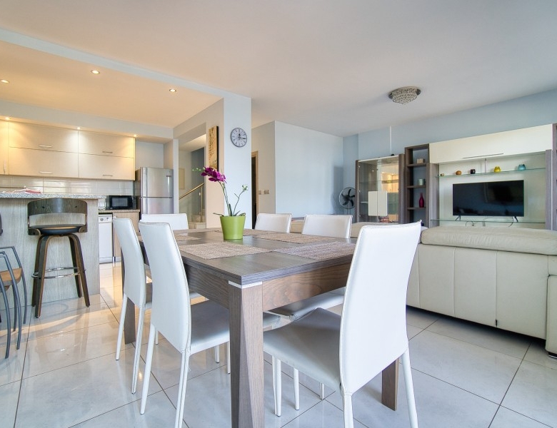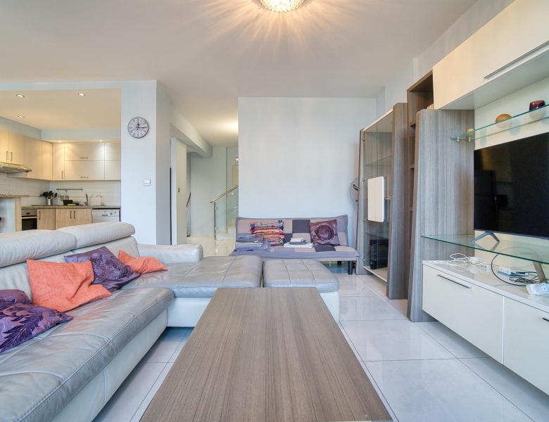Spacious bright and warm apartment with an amazing direct sea views. On the ground floor there is an entrance hall, a pantry, a kitchen, a dining / living room and a guest toilet. Exit to a huge terrace of 67 sq.m. (25 sq.m. covered, 42 sq.m. open).On the first floor there are 3 double bedrooms, one of which is a master bedroom, and another family bathroom with a bathtub. Air conditioning in all rooms, LCD TV, internet, and more. Built-in wardrobes in each bedroom. 2 parking places in title.