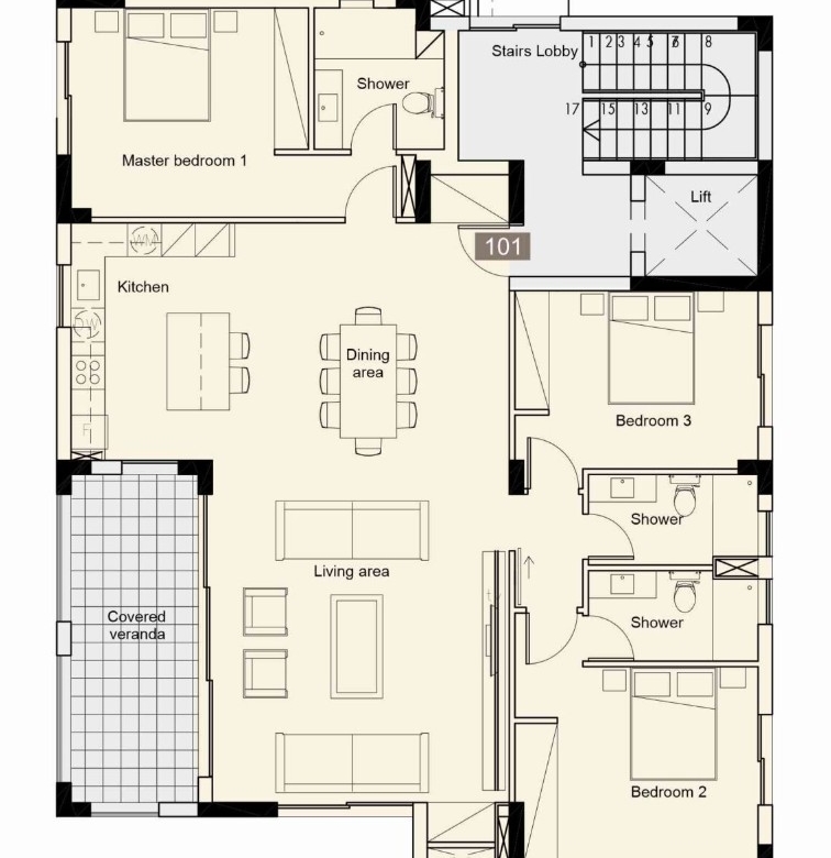 This is a three bedroom spacious apartment on its own floor. It enjoys an open plan kitchen area connected with a spacious living and dining area that have access to a covered veranda. The central location of the of the development offers unique access to all amenities and services, blue flag beaches, hotels, resorts, international golf courses, entertainment venues and shopping malls. The location will give future residents easy access to the Paphos International Airport and the Paphos to Limassol Highway.