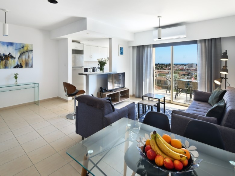 2 bedroom apartment for sale Elysia Park. This fabulous resort has been designed with the comfort, relaxation and offers wealth of services and facilities. Within walking distance you can find the bustling nightlife, shopping areas and beaches of Pafos seafront. The apartment has an open plan living/dining area and kitchen. Patio doors from the lounge & kitchen lead out to a covered veranda offering views to the swimming pool. 2 spacious bedrooms with fitted wardrobes and family bathroom conclude the apartment.