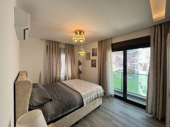 The apartment includes a balcony designed to function as an extension of the living space. Outfitted with outdoor seating, it offers a pleasant spot to enjoy morning coffee or evening relaxation. From here, you can take in the lively atmosphere of Alanya city center, with partial views of surrounding architecture and urban greenery.