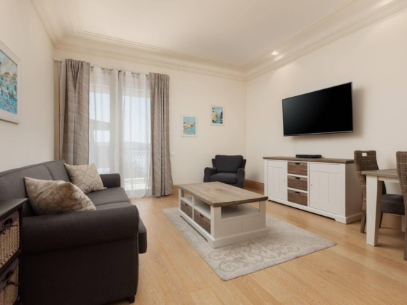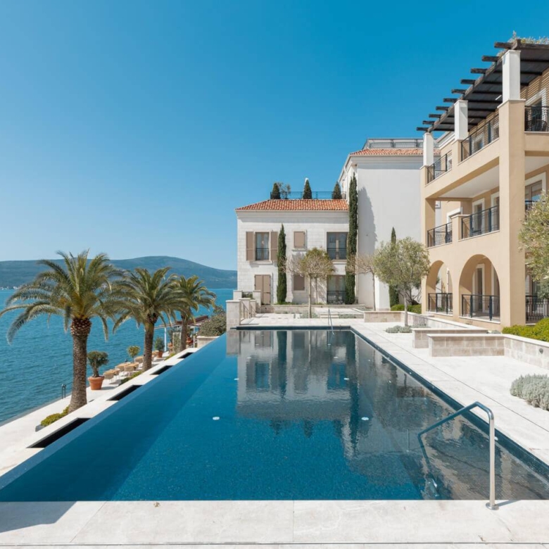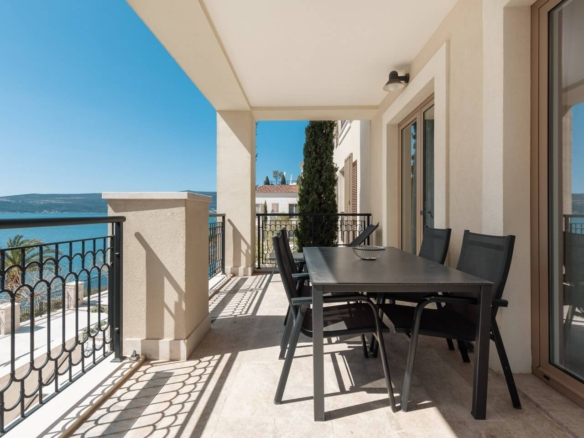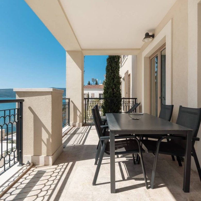 This one-bedroom apartment for sale is located in Tivat, in the modern residential building “Ksenija” in Porto Montenegro. Porto Montenegro combines a spectacular lifestyle destination with a world-class, full-service marina and luxury residential village offering premium real estate for sale and rental in this part of the Mediterranean. Thanks to the Porto Montenegro residential area and marina, Tivat is a prime location to reside in year-round, and the center of nightlife and important events.This one-bedroom apartment of 77m² is on the second floor of the building “Ksenija”. It consists of a living room with a dining area and a kitchen, one bedroom, a bathroom and toilet, a hallway, and a terrace.The apartment is for sale fully furnished. It is equipped in a simple modern style, with all the necessary appliances and central air conditioning. Probably the most beautiful part of this apartment is the big terrace. The terrace offers an enchanting view of the Tivat part of the Boka Bay and the courtyard of the building, all in greenery and with a magnificent infinity pool available to the apartment owners. Given the Mediterranean climate that prevails in Tivat, you can enjoy this view all year round by hanging out there with family and friends.Settled in a peaceful and quiet neighborhood, close to the sea, and in the nearby vicinity of all necessary amenities (ATM, pharmacy, hairdresser, day spa, grocery shop) this apartment offers great rental potential and is an excellent investment opportunity. The boulevards of the Porto Montenegro marina village bring open-air waterfront shopping designed to create an intimate and cosmopolitan environment, ideal for a relaxing evening stroll with leisurely shopping and fine dining opportunities.Porto Montenegro marina village is located at the heart of town, only 3km away from the international airport Tivat. From your apartment to the Old Town Kotor which is under UNESCO protection is less than 12km. The capital of Montenegro and airport Podgorica are only 85km away.We believe that this modern apartment in the luxury Porto Montenegro marina village won’t be long on the market, so if you like it, feel free to contact us for more information.