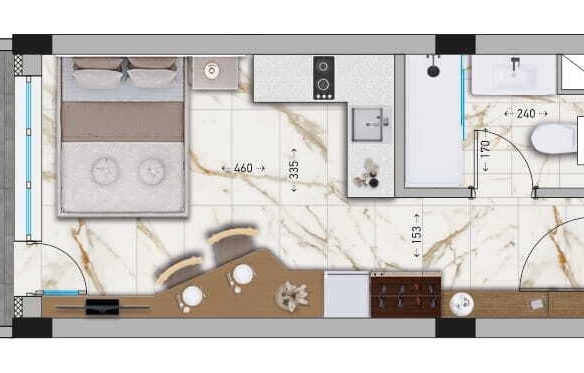 The studios are in the completion phase and are located on different floors in the Sole Mare Aheloy complex, which is also in the completion phase.