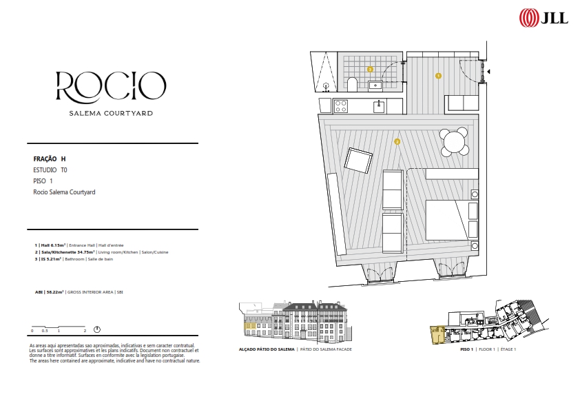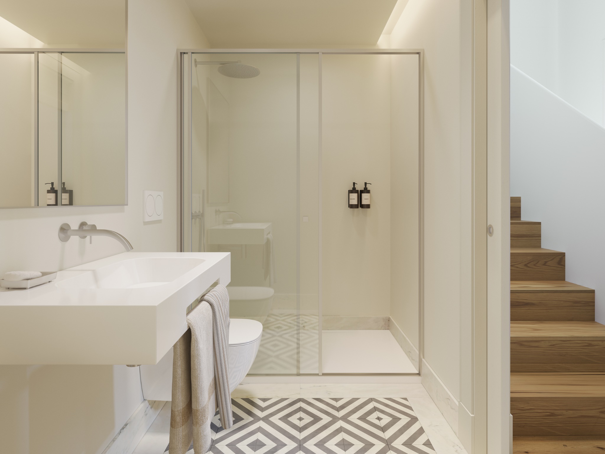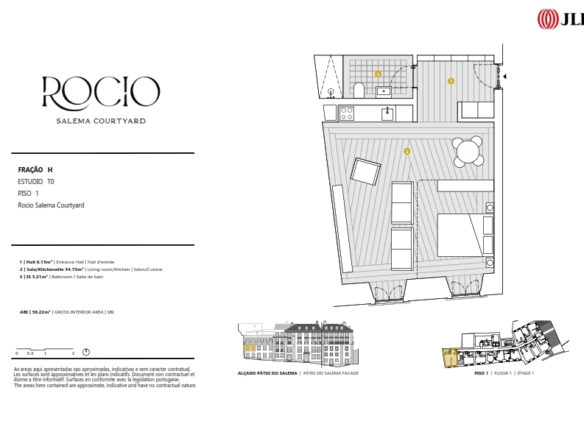 Studio apartment, new, with 58 sqm (gross floor area), at the Rocio Salema Courtyard project, in Praça do Rossio, Lisbon. The Rocio – Salema Courtyard, a building comprising 36 studio, 1-bedroom, 1-bedroom duplex and 2-bedroom duplex apartments, is located next to one of the most iconic squares in Lisbon, Praça do Rossio.This corner of Lisbon that marvels people from all over the world represents in a perfect manner the intersection between heritage and modernity, which results in a picturesque and welcoming space in the centre of the hustle and bustle of the city. Despite being a rehabilitated building, the Rocio – Salema Courtyard has kept its typical Lisbon structure and the original three storeys, overlooking the river. The Rocio is the ideal address for those wanting to live or invest in one of the most vibrant cities due to the constant tourism growth. The development is near important monuments of the metropolis, such as the statue of D. Pedro IV, the Teatro D. Maria II and the Coliseu dos Recreios. Next to Praça do Rossio, the building has a privileged location in terms of transport, at a short distance from the underground, bus and the Rossio train station. This is the perfect opportunity for those wanting to be where the action is while having a luxurious haven to call home.
