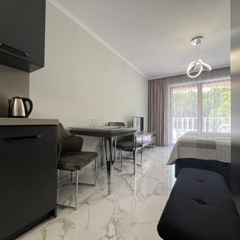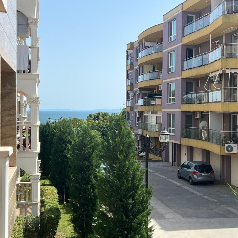 We offer you a studio with sea view and a living area of 44 sqm, located on the 2nd floor of the luxury complex Valencia Garden in Nessebar, Bulgaria. The studio is furnished with high-quality furniture and appliances. The apartment features a living and sleeping area with a double bed, kitchenette, dining area, bathroom with shower, and a balcony with a sea view.