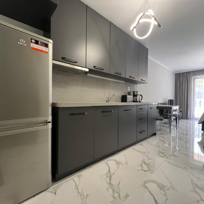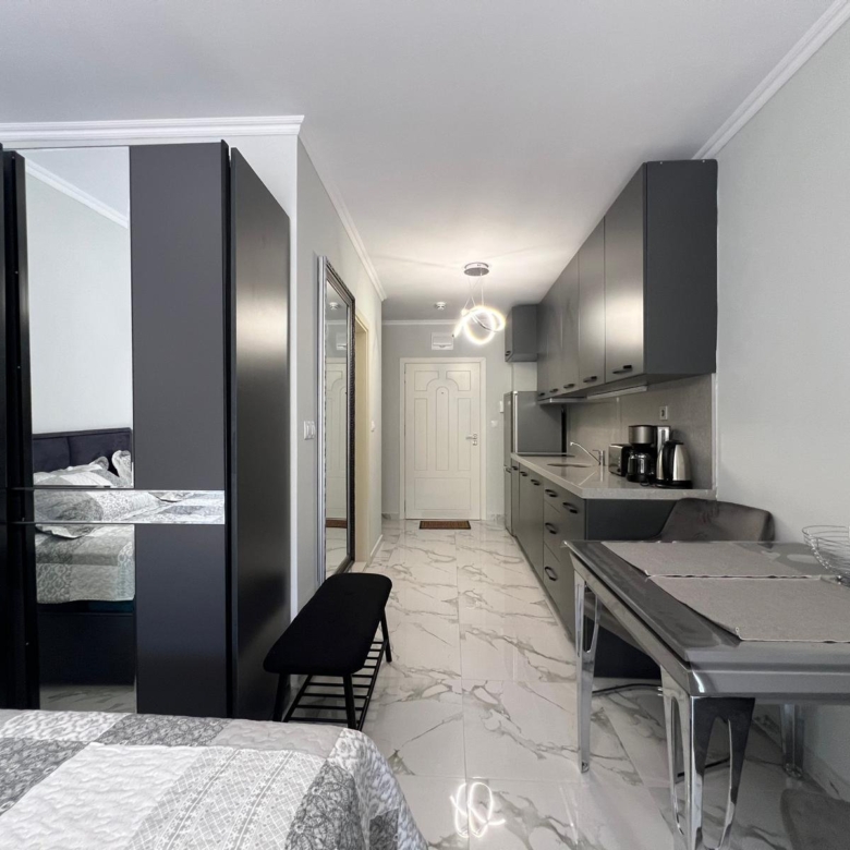We present to you a cozy studio apartment with partial sea views from the balcony. The total area of the apartment is 44 sqm. It includes an entryway, a spacious room with a kitchenette and double bed, a bathroom with shower, and a balcony. Located on the 2nd floor, it is designed for long-term and comfortable living, featuring modern renovations and high-quality furnishings.