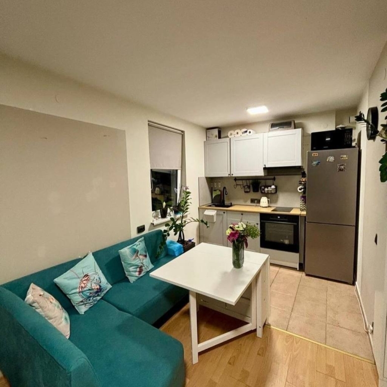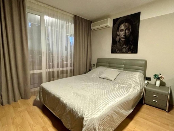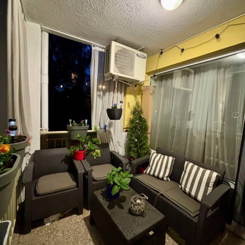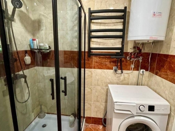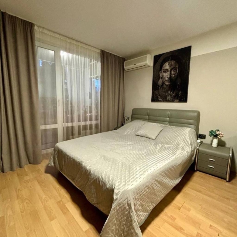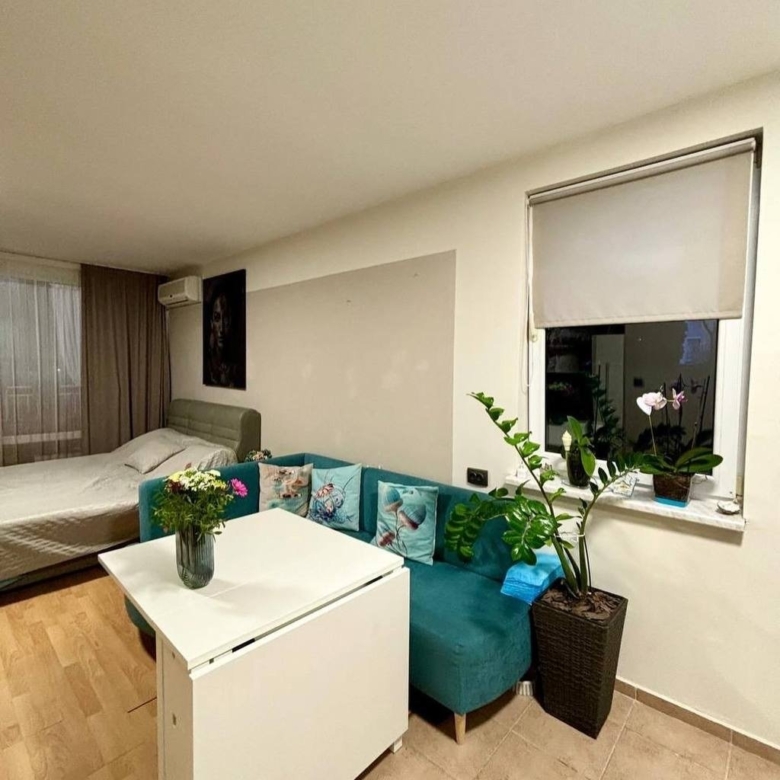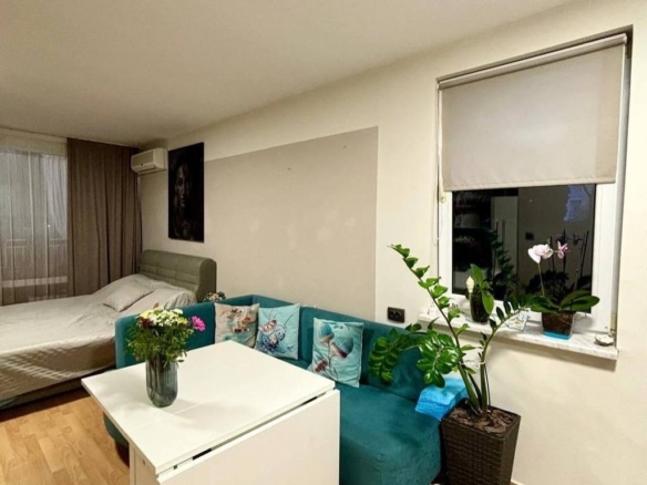 The apartment boasts a stylishly designed interior. On the left side of the entrance, there is a TV and a dark-colored wardrobe. In the center of the studio, there is a large double bed, air conditioning, a sofa, a coffee table, and a house plant. The kitchen is compact yet cozy and functional, equipped with an oven, a microwave, and a large fridge. The bathroom has a fresh, modern look with new fixtures and includes a washing machine. The apartment also has a spacious balcony that accommodates a set of outdoor furniture. This is an excellent choice for both short and long stays.