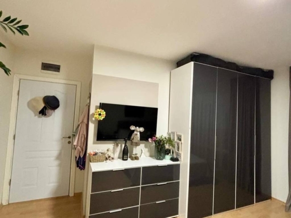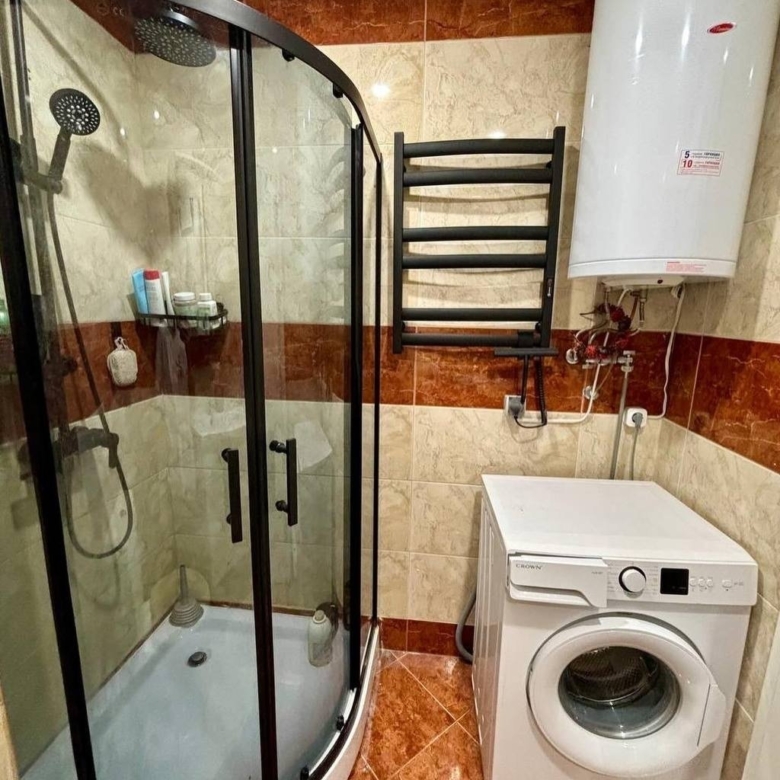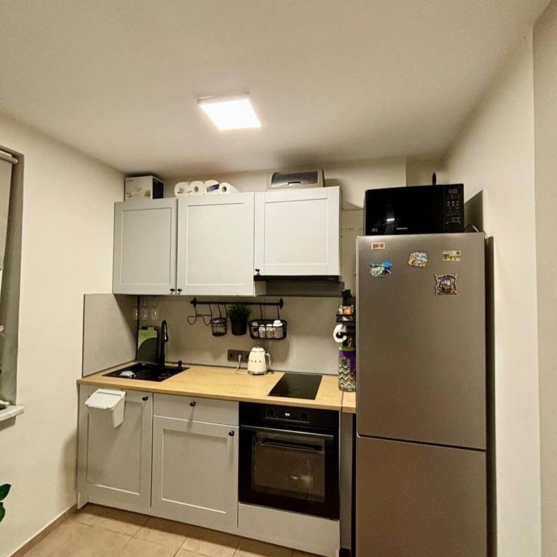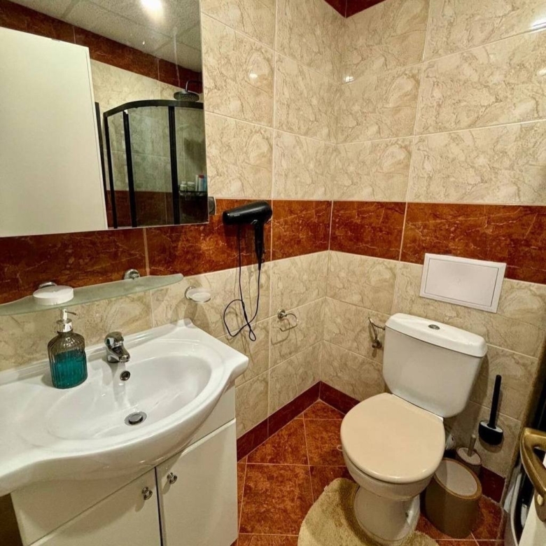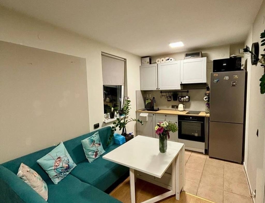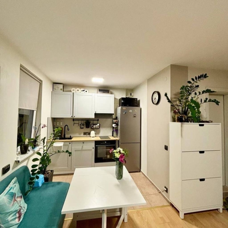 The apartment boasts a stylishly designed interior. On the left side of the entrance, there is a TV and a dark-colored wardrobe. In the center of the studio, there is a large double bed, air conditioning, a sofa, a coffee table, and a house plant. The kitchen is compact yet cozy and functional, equipped with an oven, a microwave, and a large fridge. The bathroom has a fresh, modern look with new fixtures and includes a washing machine. The apartment also has a spacious balcony that accommodates a set of outdoor furniture. This is an excellent choice for both short and long stays.