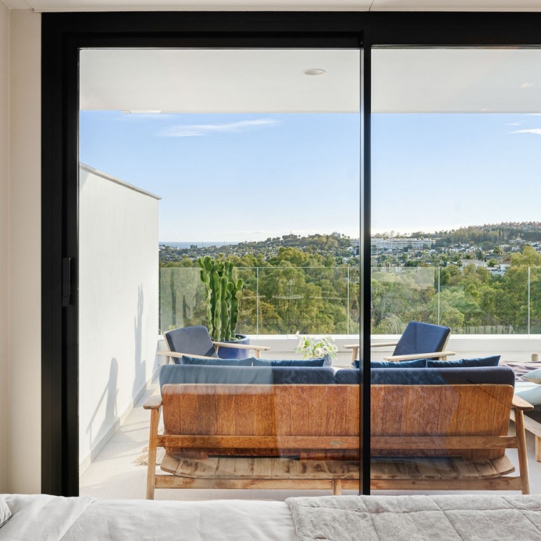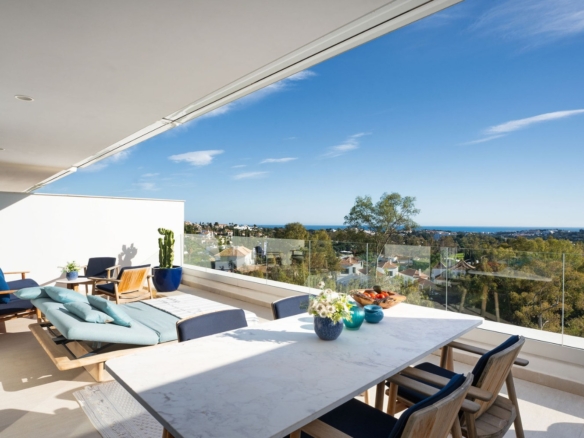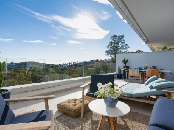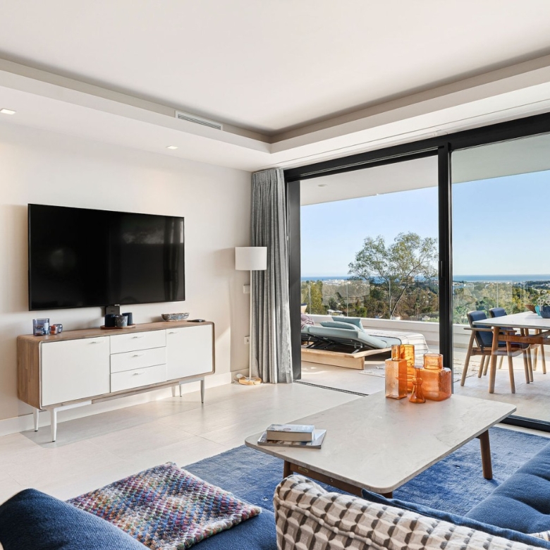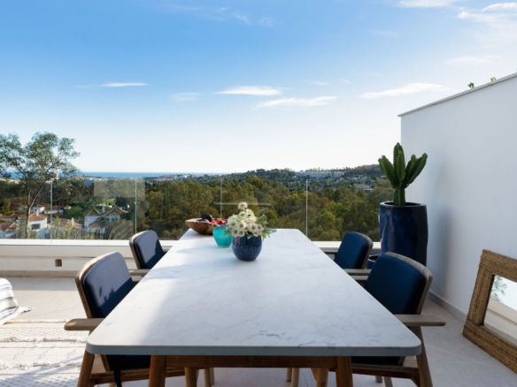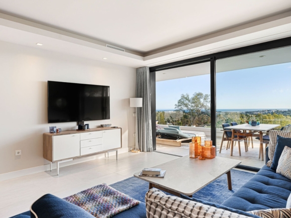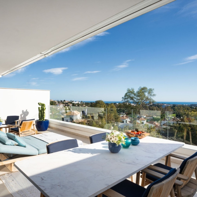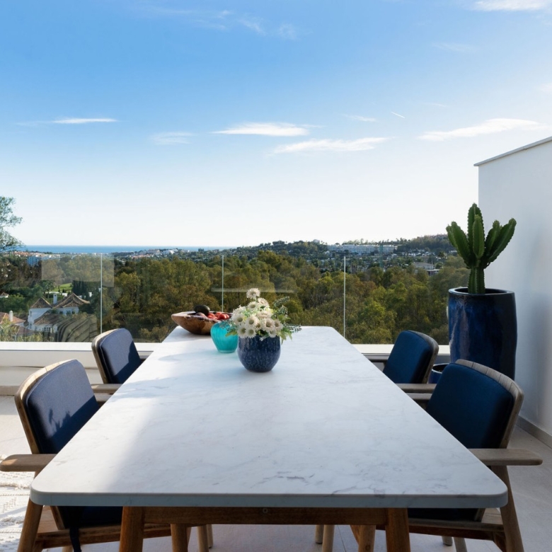 This sleek and contemporary first-floor apartment is located in the sought-after urbanization of Azahar de Marbella in Nueva Andalucia. Enjoy breathtaking views of the valley and sea from the spacious, south-facing terrace, which is partly covered for year-round comfort.