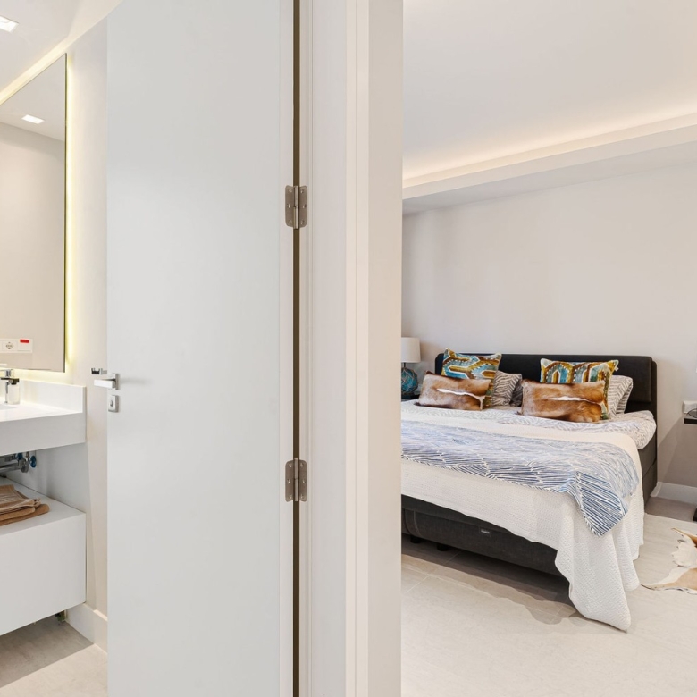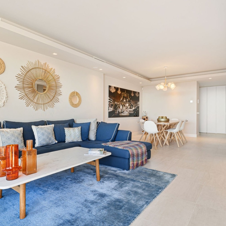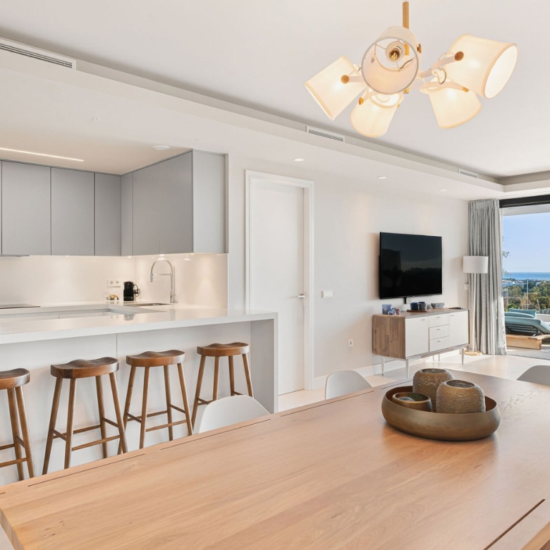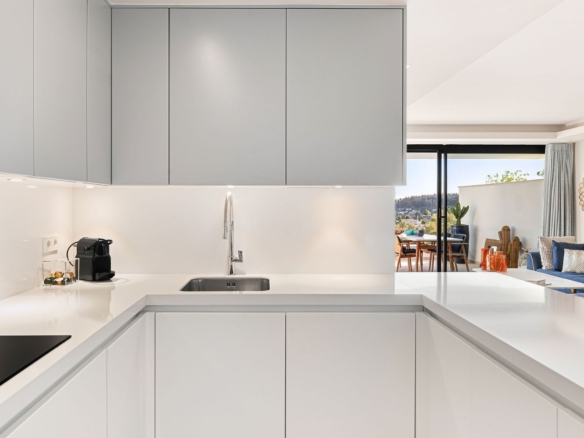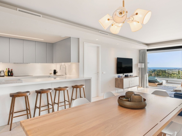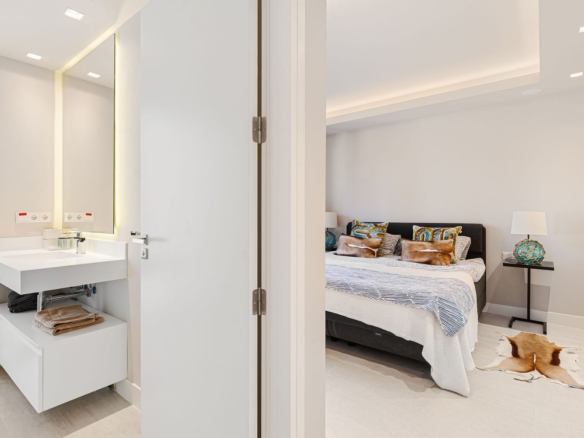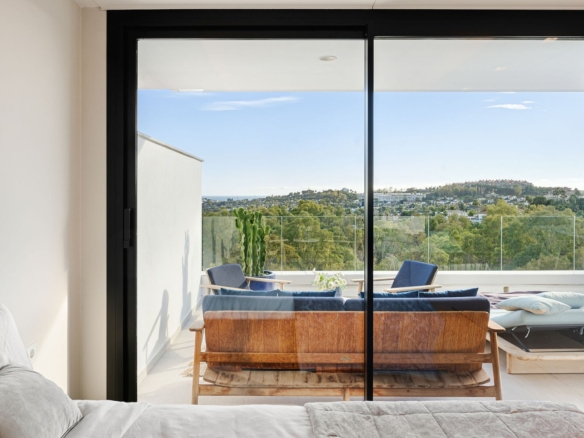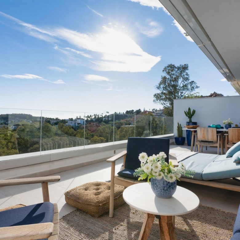 This sleek and contemporary first-floor apartment is located in the sought-after urbanization of Azahar de Marbella in Nueva Andalucia. Enjoy breathtaking views of the valley and sea from the spacious, south-facing terrace, which is partly covered for year-round comfort.