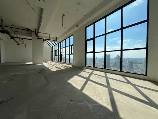 Lots of Room to Make This Your OwnThis is a pretty rare find—a large, bare-shell condo unit on the 40th & 41st floor offering 462 sqm of open space. It’s a corner unit, so you get windows on multiple sides letting in tons of natural light all day. The high ceilings and floor-to-ceiling windows really open up the space and give you those panoramic views of the Bangkok skyline you hear about from Sathon.Layout and Features to NoteInside, you’ve got a double door entrance that leads into this big, empty canvas. There are multiple structural columns here and there, so any renovation or fit-out will need to work around them, but that’s part of what gives the place character. There’s a balcony or ledge area you can access, plus a spacious rooftop terrace with glass safety railings—great for outdoor seating or entertaining with that amazing urban backdrop. Also, you can actually see some green spaces from here, which is a nice break for a high-rise spot.With a potential 4 bedrooms and 5 bathrooms, plus 4 parking spaces, this freehold resale unit is perfect if you want to create a custom luxury home or an impressive executive condo right in the heart of Thung Mahamek. The white-painted walls and glass ceiling section add to the bright, airy feeling, making this a space you’ll likely spend most of your time in once it’s done right.