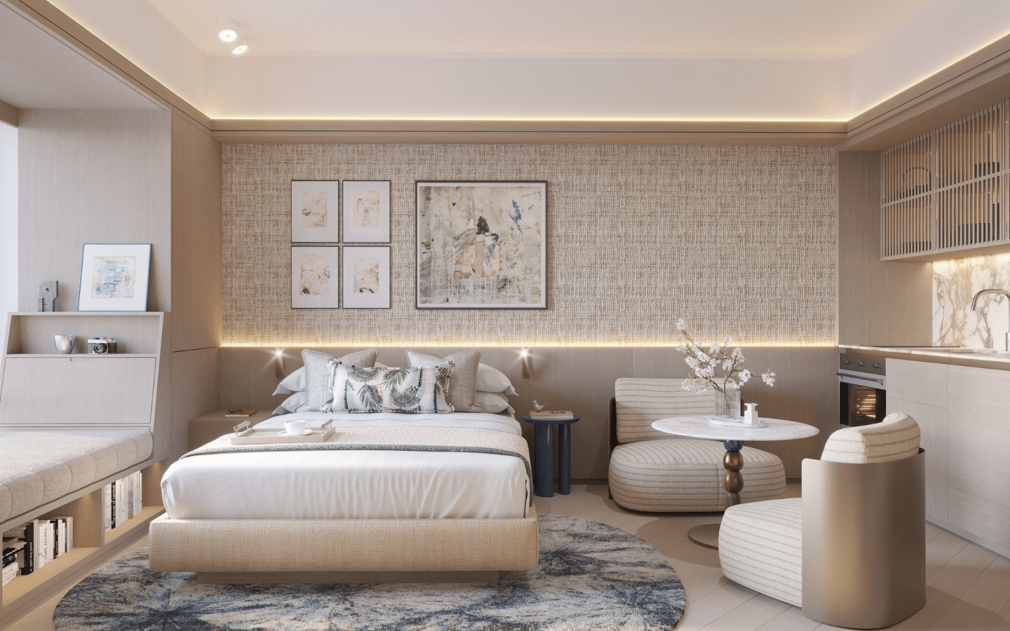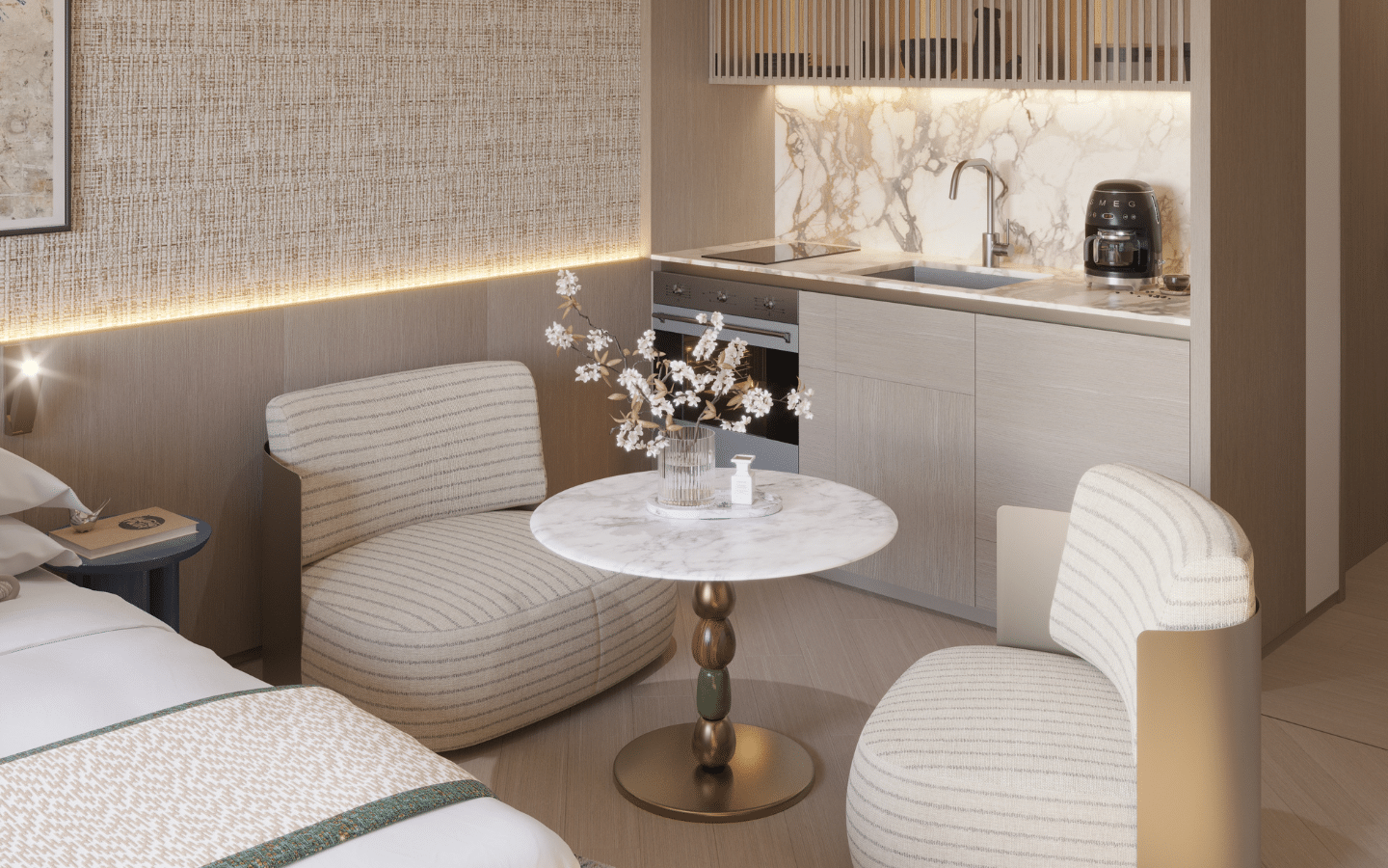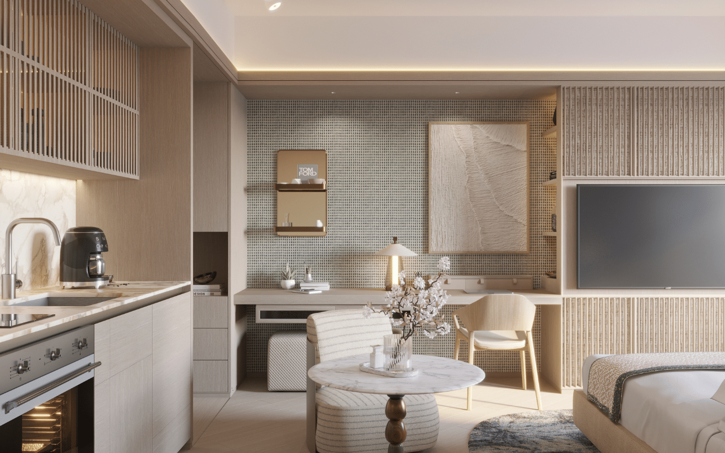 ~35 sqm open-plan layout with defined living, dining, kitchen, and sleeping zones