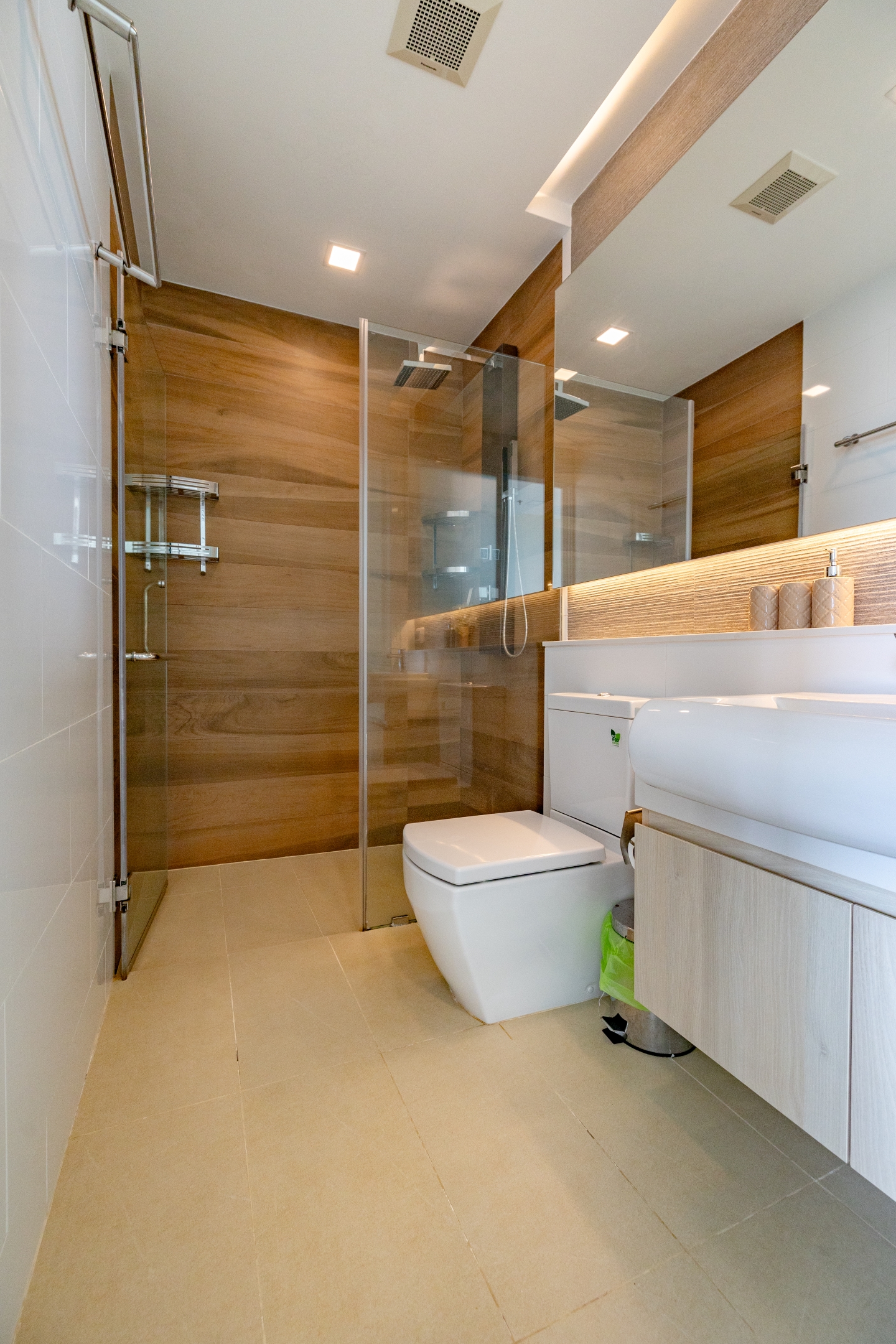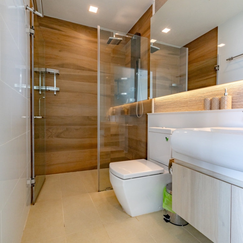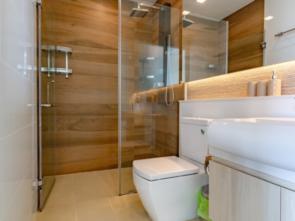 Bathrooms: 2 modern bathrooms with glass partitions and rain showers