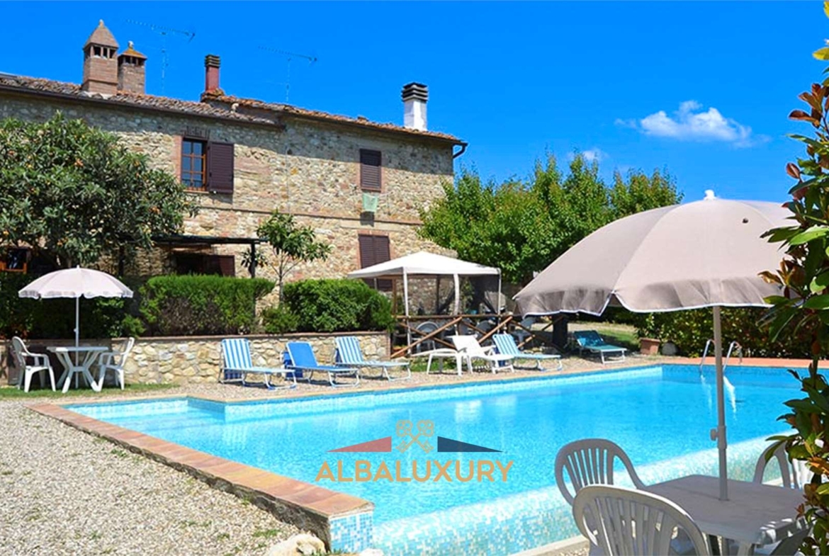 This beautiful agritourism farm is built around a watchtower dating back to 1200 and then features a stone hut and an old granary^The property is about 21 hectares in total^The main body comprises :^a dwelling derived from the ancient tower which boasts a living area, kitchen, laundry room a bathroom and a study , going up to the first floor we find 4 bedrooms, 4 bathrooms and going up again to the second floor from the tower there is an enchanting view over the whole surrounding area .^We then find 4 independent flats all with a living room and kitchenette, two bedrooms and a bathroom.^Two charming flats have been created in the stone hut:^A 55 sq m flat consisting of a large living room with sofa bed, kitchenette, double bedroom, bathroom with shower and private outdoor area furnished with garden furniture.^A 100 sq.m. flat on two floors, comprising on the ground floor a dining-living area with a double sofa bed, fireplace and kitchenette, a double bedroom, a twin bedroom, bathroom with shower. On the upper floor: 1 double bedroom and bathroom with shower. ^Two ground floor flats have been created in the old barn:^A 55 sq m flat consisting of a large living room with sofa bed, kitchenette, fireplace and sofa bed. On the upper floor there is a double bedroom and a bathroom with shower. Outside there is a private area furnished with garden furniture.^A second 85 sq.m. flat composed on the ground floor of a dining-living room with kitchenette, fireplace and sofa bed. On the upper floor: one double bedroom, one twin bedroom, bathroom with shower. Outside there is a private area furnished with garden furniture.^Of the 21 hectares, one hectare is cultivated with olive trees with a total of 600 plants and partly with vineyards for a total of about 12 hectares of which 8 hectares are Chianti Classico, the remaining production is Sangiovese, Canaiolo Nero, Merlot, Petit Verdot, Malvasia and Viognier.^^Being located between the influential and powerful Renaissance city par excellence – Florence – and Siena, Castellina presents itself as the ideal place for those visiting Tuscany for the first time and wishing to explore the Chianti area and its wonders, such as the towns of Greve in Chianti or Castelnuovo Berardenga, charming villages that deserve to be included in your itinerary. And, as if the astonishment of the local architecture that preserves the charm of times gone by were not enough, the enchantment of nature and the panorama that opens up before those who drive along the roads through the Pesa, Arbia and Elsa valleys complete a fairytale picture.^Families with children will have parks to visit, numerous activities to do outside^Anyone who ventures out to discover Castellina in Chianti – even the most seasoned experts – its events, the routes that wind through its hills and the activities that prop,