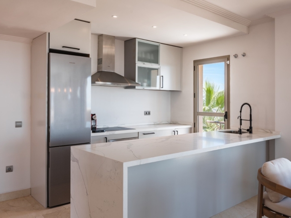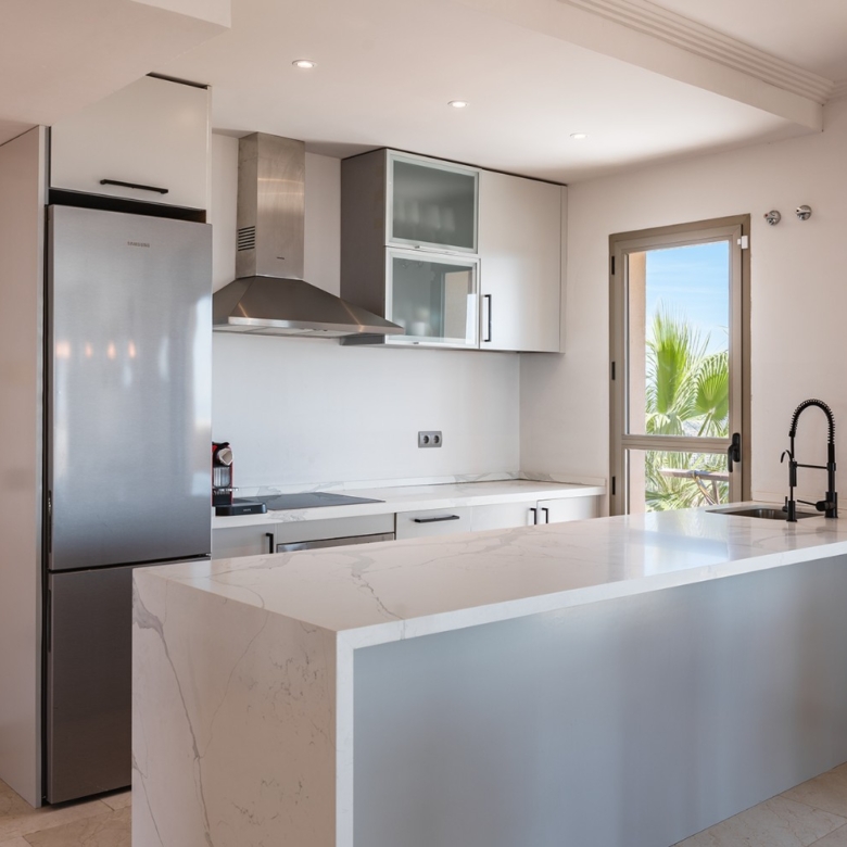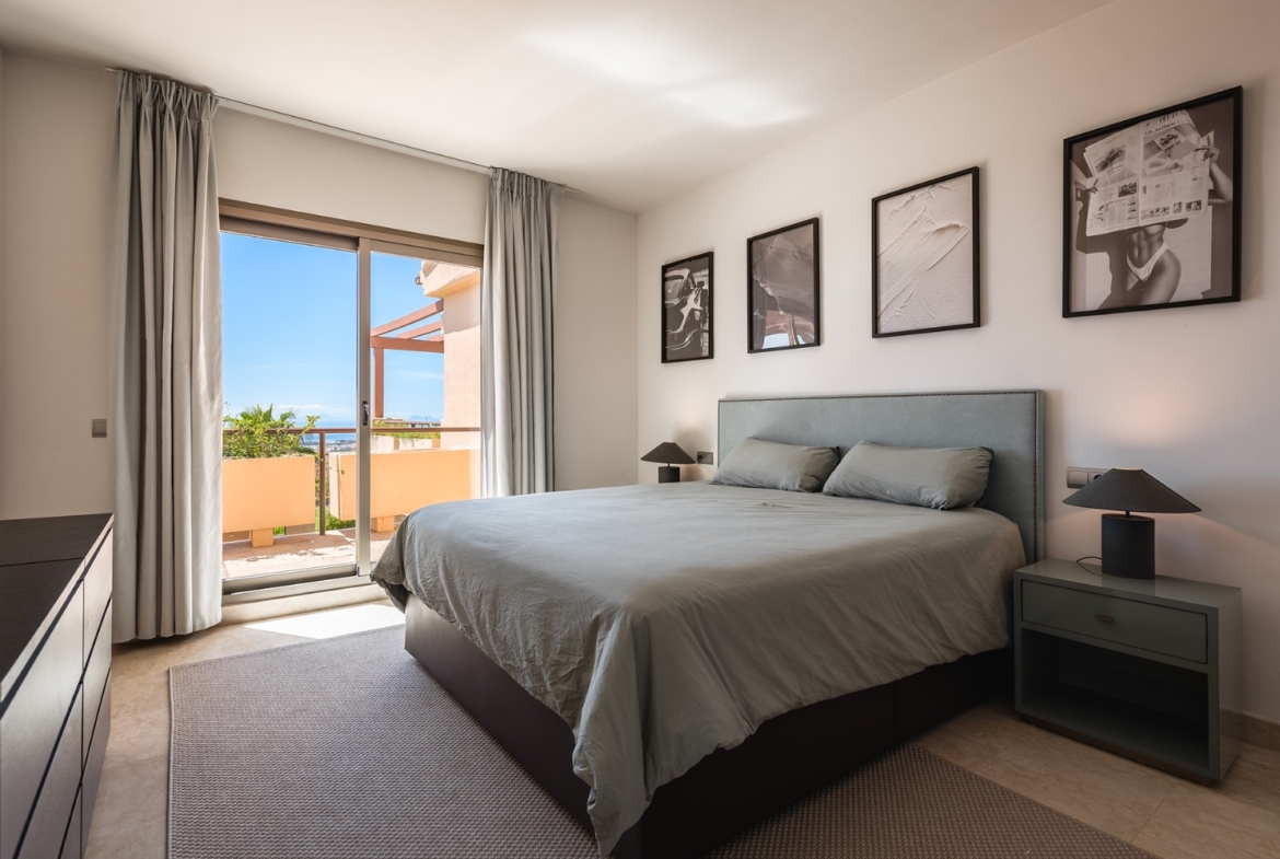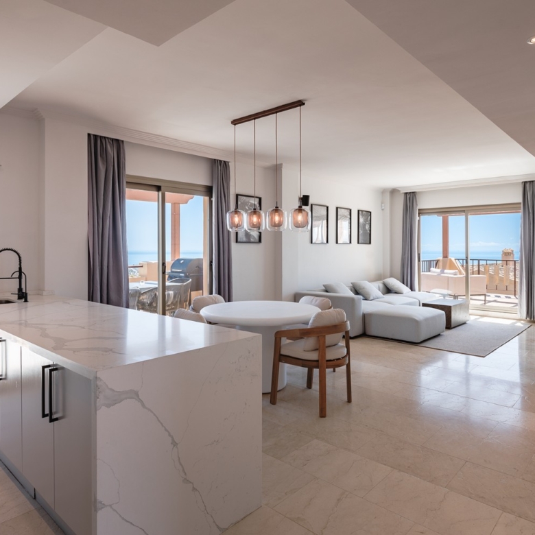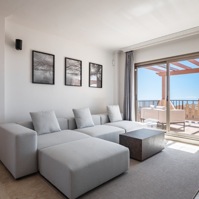 Spectacular one-level penthouse enjoying panoramic sea views in Hacienda del Señorio de Cifuentes, Benahavis. All in one level, the property comprises an entrance hall; a living/dining room with access to two terraces, one southeast-facing with views of La Concha mountain, Atalaya golf course, and the sea, and one south/southwest-facing with panoramic sea, Gibraltar, and North Africa views; an open-plan, fully equipped kitchen with top-quality Siemens appliances; an en-suite master bedroom with access to the terrace; and 2 bedrooms sharing a bathroom. Extra features include 24h security and concierge service; CCTV cameras throughout; A/C hot and cold with Airzone controllers; underfloor heating throughout; and a gas BBQ. Located in a peaceful location, just a 15-minute drive to Puerto Banús and the beach.