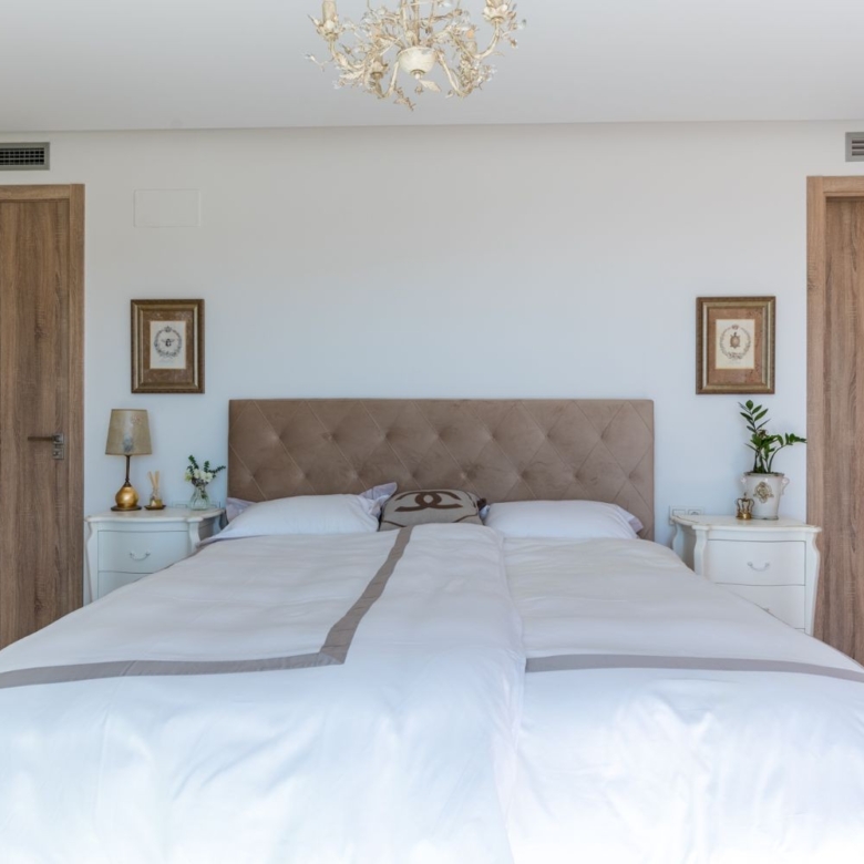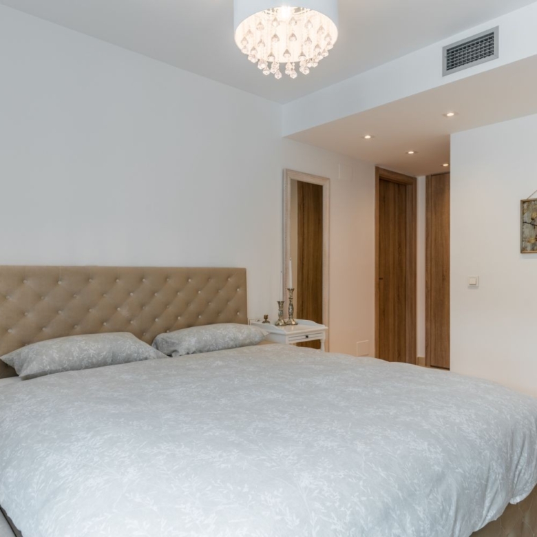 The current owners have done many upgrades to the property therefore this penthouse is like no other in this complex. This penthouse is decorated with a great style and class, and it is immaculately kept by its current owners. It is sold fully furnished, and you will be able to enjoy this luxury home from day one. It is distributed over two levels of the living area and in total you have 165 sqm of the living space + two spacious south facing terraces each over 50m2. The terrace downstairs is covered and the terrace upstairs is uncovered and is a perfect place to sunbathe all year round. On the main level you find a spacious living-dining area with an open plan kitchen, kitchen island and bar table. Huge sliding windows from floor to ceiling with triple glazing leads you onto the terrace. Needless to say, you do not need to go to the terrace to enjoy the views, there are sea views from every corner of this spacious living room. You will also find two bedrooms, one of which is an en-suite, a utility room with washing machine and dryer, and another full bathroom that is also for guests. On the top floor there is a spacious en-suite master bedroom with even more impressive sea views, plenty of wardrobes and access to an upper terrace. Included with the property are two parking spaces in the underground garage and a storage room.