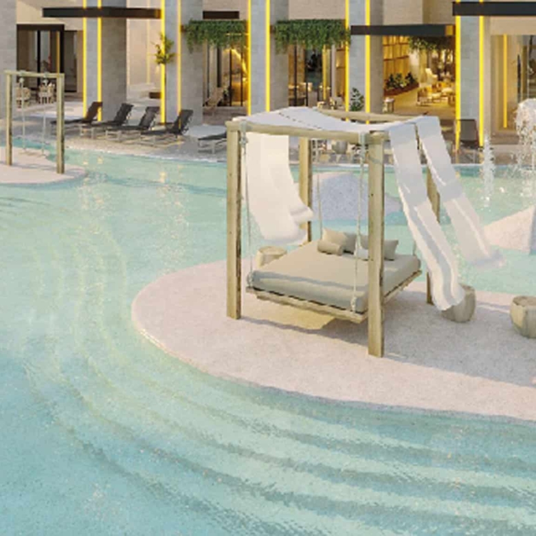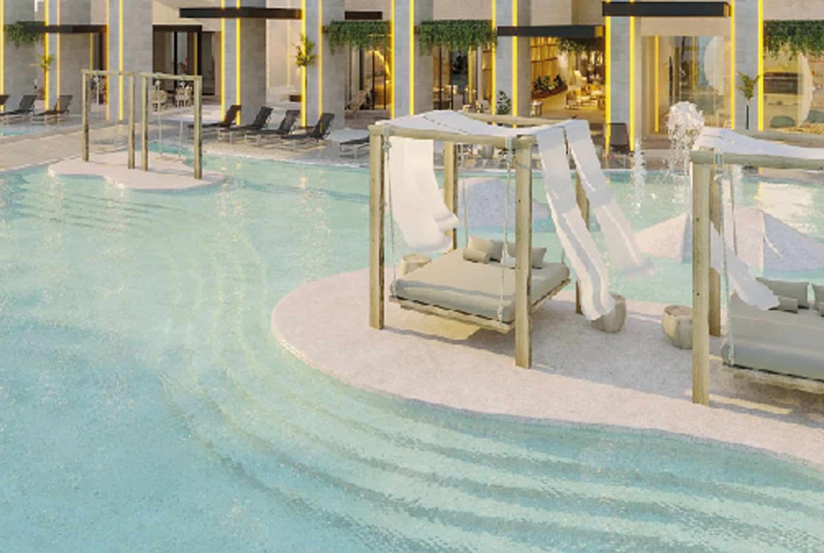 State-of-the-Art Amenities: Residents enjoy access to premium features such as a rooftop sky pool, spa, indoor and outdoor gyms, and a sky kitchen. The complex also includes tennis and paddle courts, a golf simulator, coworking spaces, and a kids’ club.