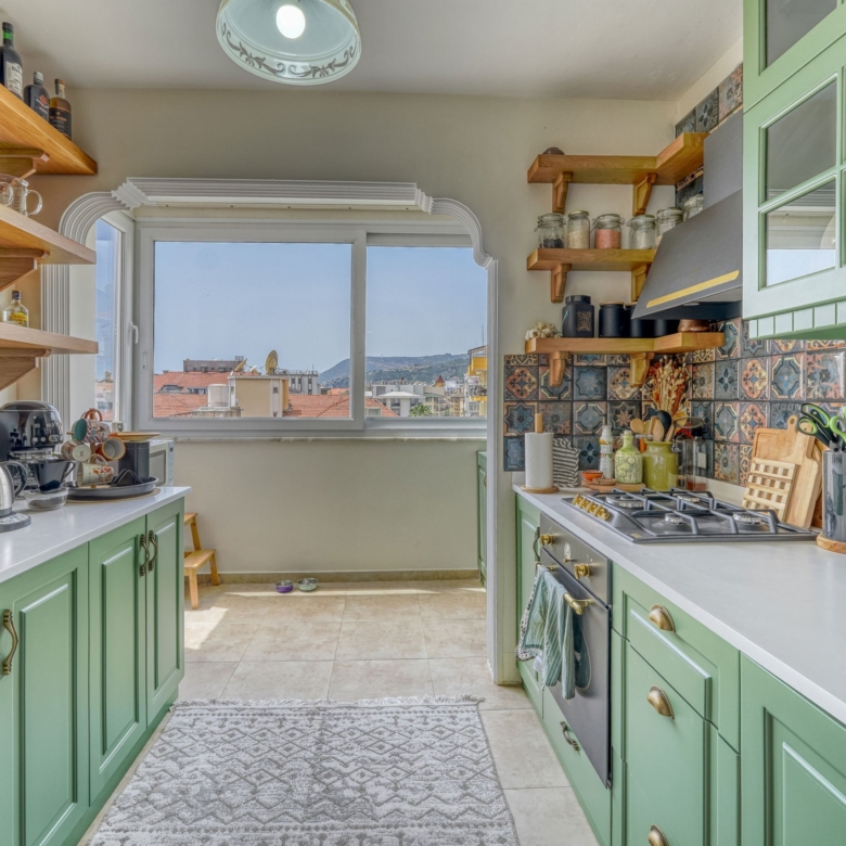 The mint green cabinetry is a bold yet serene choice, paired beautifully with awhite countertop and ceramic backsplash tilesin traditional Mediterranean patterns. Wooden open shelves offer both function and character, allowing the display of handmade cups, ceramics, and spices. Avintage-style Vestel fridgebrings nostalgic flair without compromising modern function.