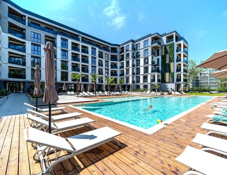 Brand new 1 BED apartment, 50 sq.m., in Emilia Romana Verde, Sunny beach 1 BED luxury apartment is offered for sale in the complex “Emilia Romana Verde”, Sunny Beach The Emilia Romana Verde complex is a brand new residential complex (Act 16 – 2025) located in the center of the resort town of Sunny Beach. Within walking distance from the complex there are: shops, cafes, restaurants, pharmacy, post office, bank, medical center, bus stop, etc. Complex infrastructure: – swimming pool with children’s area; – parking; – restaurant; – bar; – 24-hour security. The apartment with a total area of 50 sq.m. is located on the 3rd floor and consists of: a spacious living room with a kitchenette, dining area,, one bedroom, a bathroom with shower and washing machine and a terrace with views to the surroundings. The apartment is contemporary furnished, equipped with appliances and ready to move in. Brand new furniture and appliances. Act 16; Suitable for year-round use and renting out. Distance from the sea – 800 m Maintenance fee – 16 euros per sq.m. *Price – 120000 EUR includes storage room