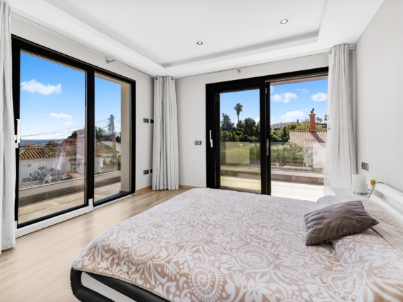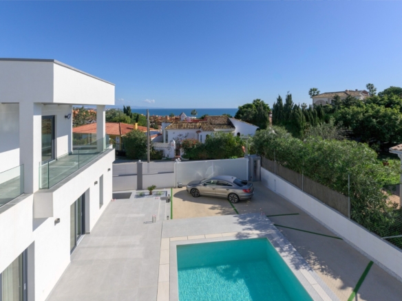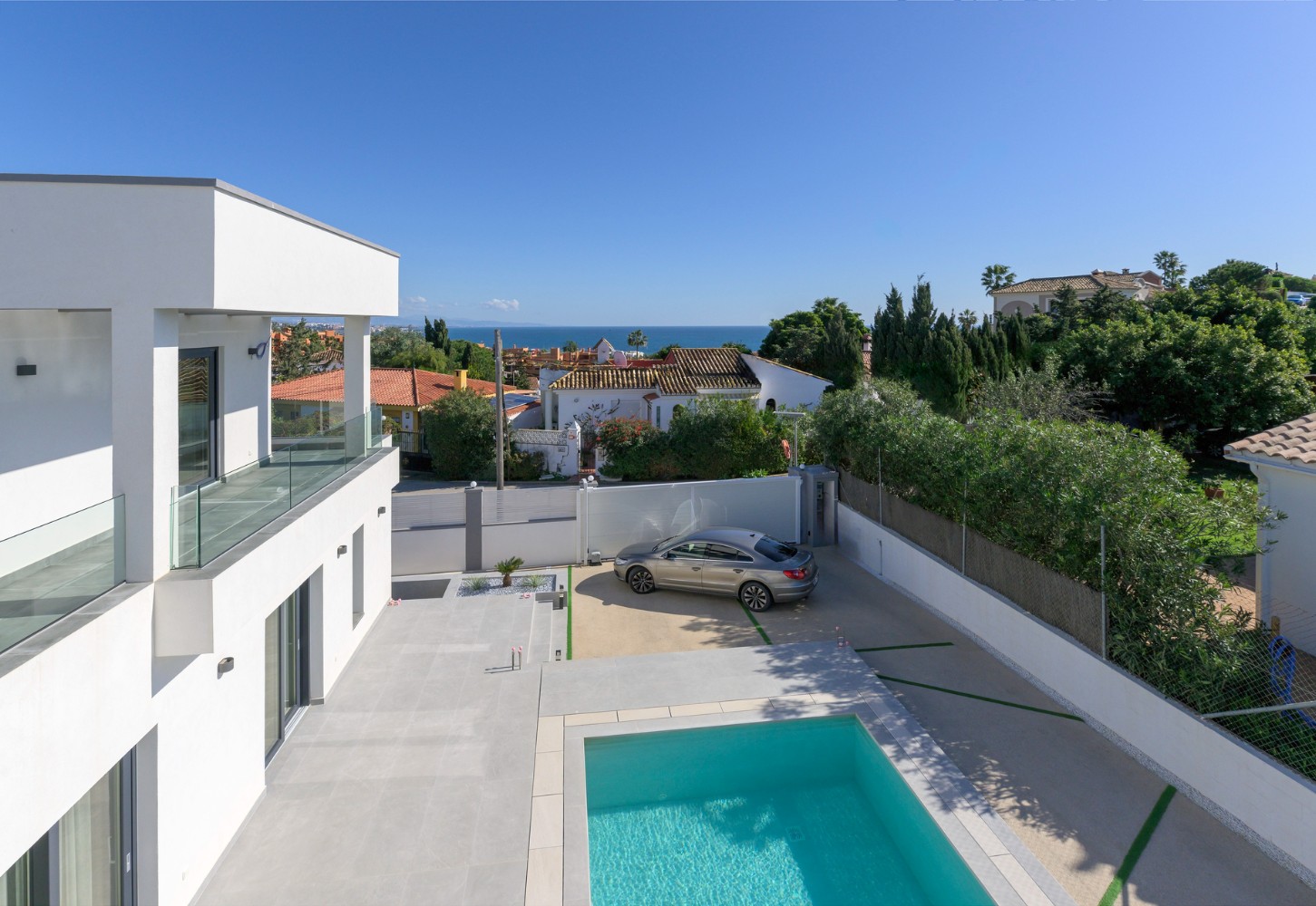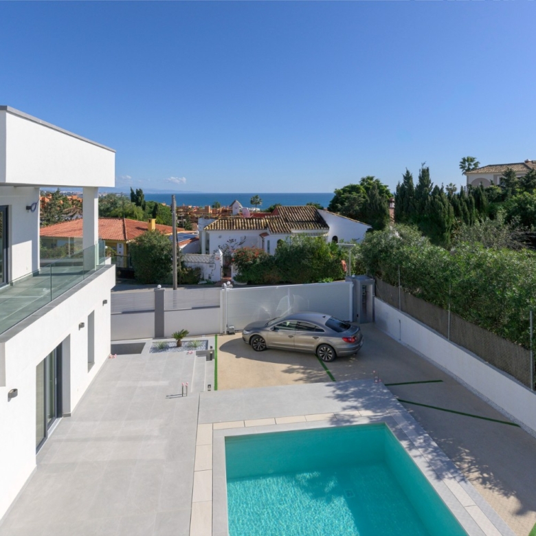 Situated in the prestigious Buenas Noches neighborhood, this newly constructed villa offers panoramic sea and mountain views, just 500 meters from the beach and minutes from the vibrant heart of Estepona.