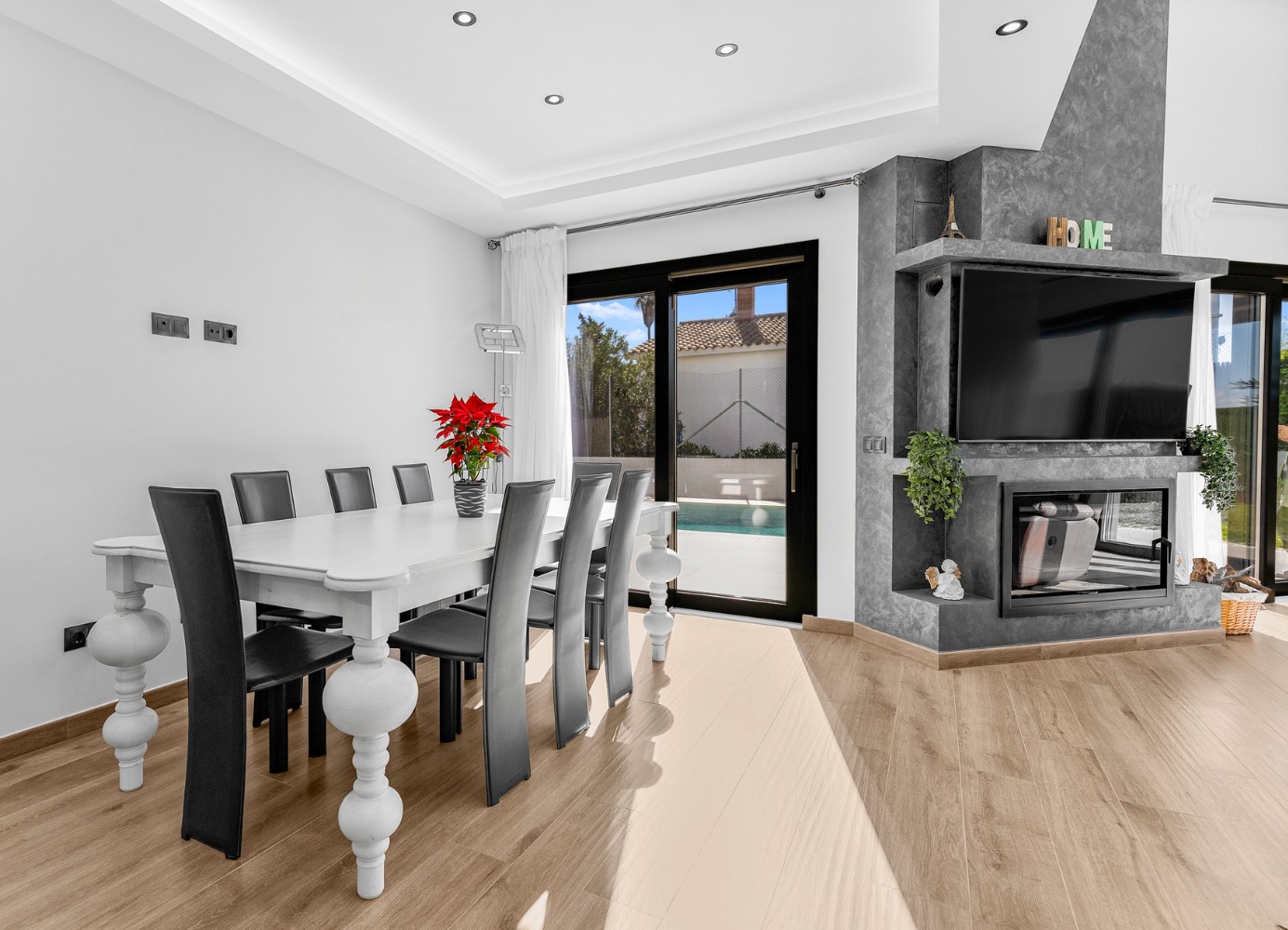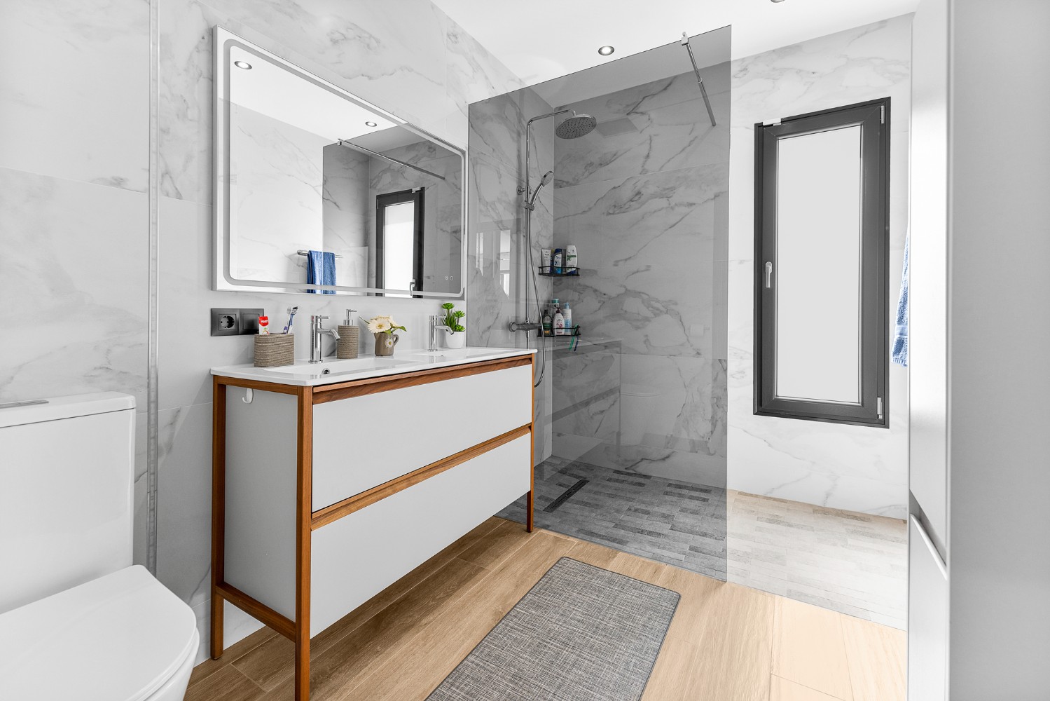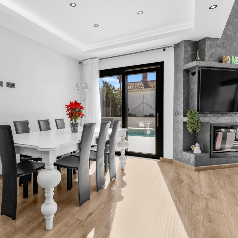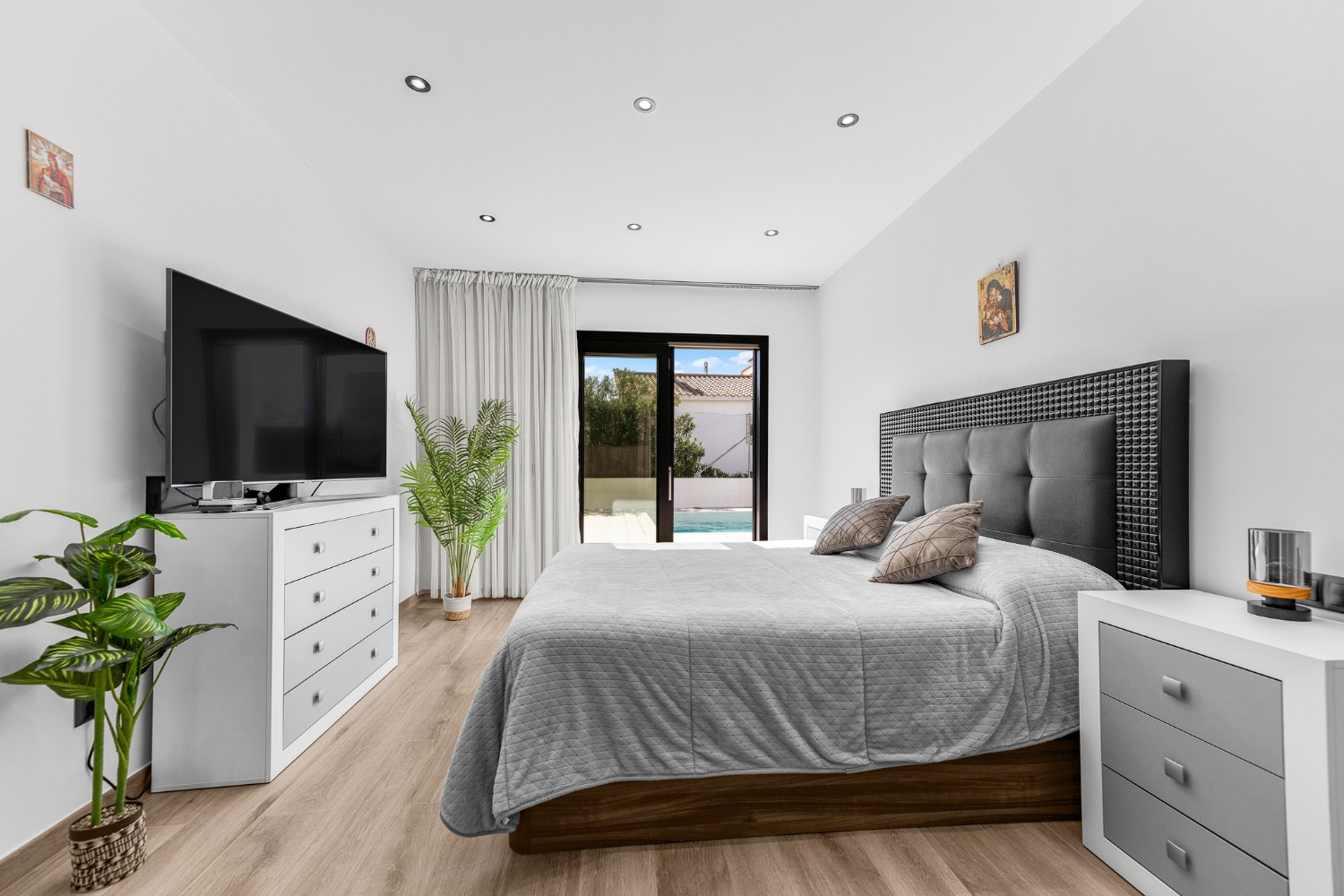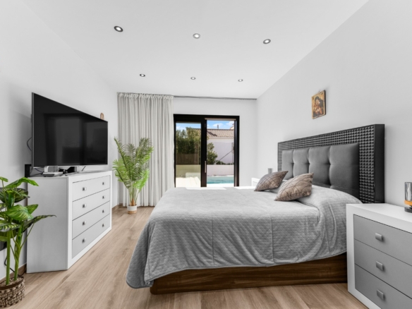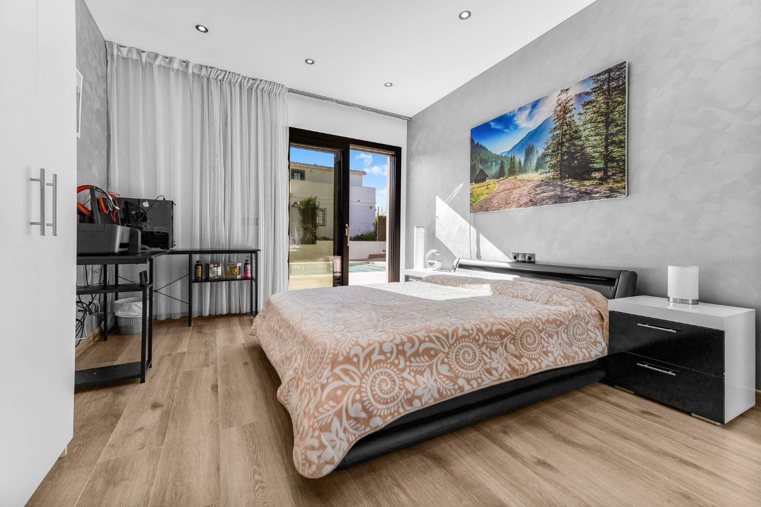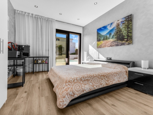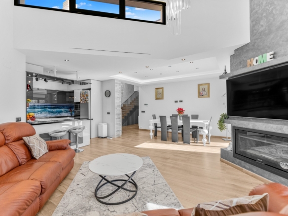 The ground floor features two well-appointed bedrooms, including one with an en-suite bathroom. Upstairs, the luxurious master suite opens to a private solarium with sweeping views and pre-installation for a jacuzzi, offering the ultimate in relaxation.
