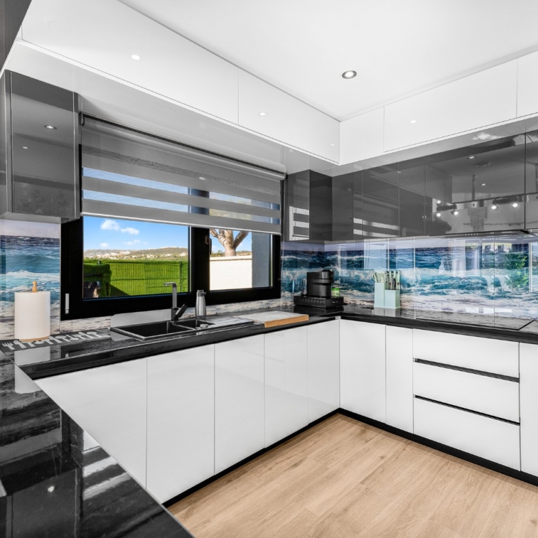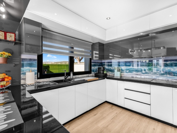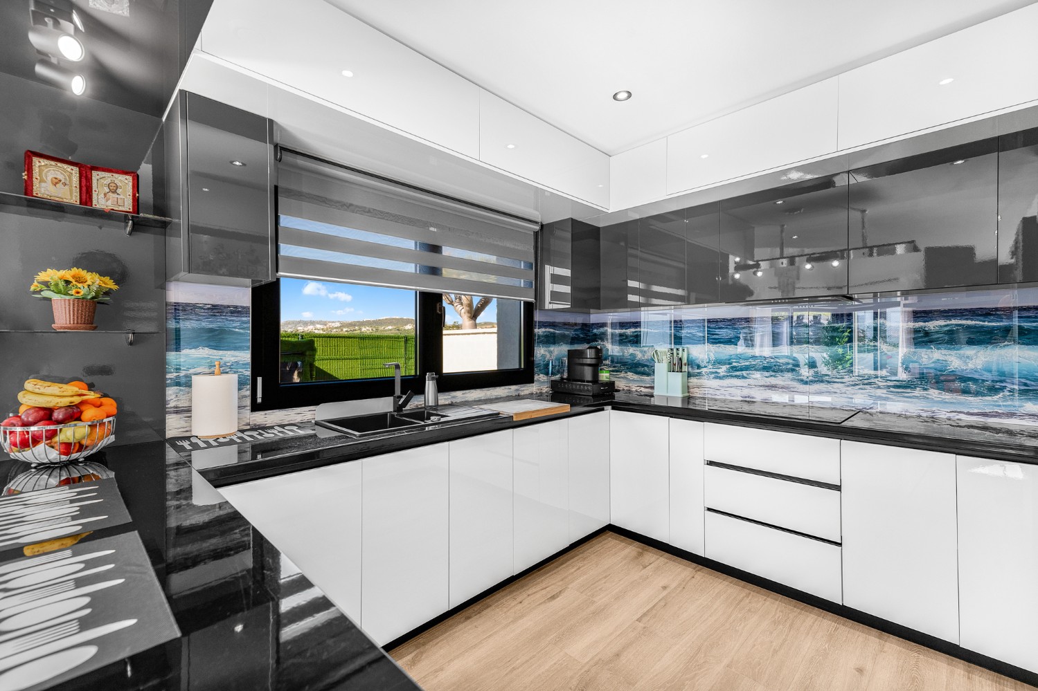 Built with sustainability in mind, the home is equipped with solar panels, a rainwater collection system and boasts soaring 4.5-meter ceilings that enhance its bright, modern ambiance. The open-concept kitchen and living area flow effortlessly onto a sun-drenched terrace with an infinity pool—perfect for soaking in the serene surroundings.
