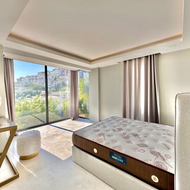 Thisfully renovated apartment for sale in Alanya Center blends modern luxury with unforgettable scenery. Located just 500 meters from the beachin the heart of the city, this stunning 2-room property offers uninterrupted views of the Alanya Castle, shimmering Mediterranean Sea, and city skyline—thanks to its impressive floor-to-ceiling windows in both the living room and bedroom.