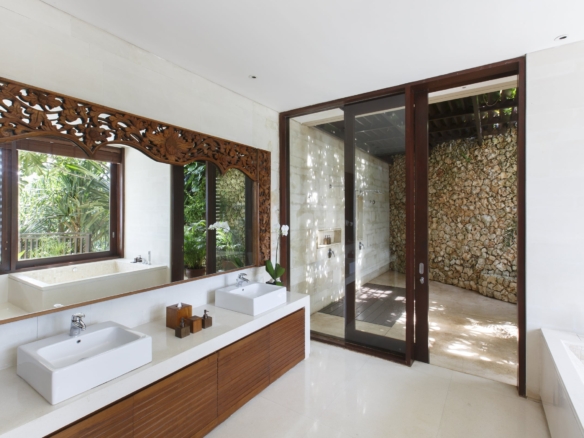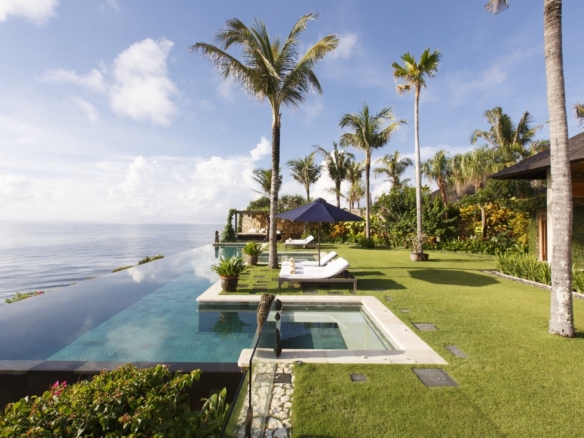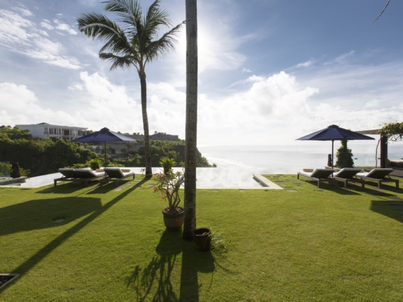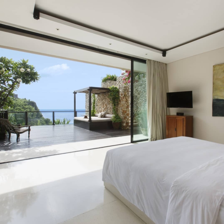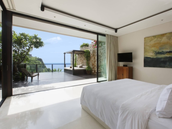 This villa spans 750 sqm over two meticulously designed levels, boasting grand indoor and outdoor spaces. The main entertainment area sits dramatically on the cliff’s edge, featuring an infinity pool, plush lounges, and a tranquil bale, all surrounded by manicured lawns. Guests will revel in five air-conditioned bedrooms, each with en-suite bathrooms, double vanities, and luxurious soaking tubs, ensuring the epitome of comfort. Additional amenities include a cinema room, integrated sound system, and a fully equipped kitchen paired with dining space for twelve.