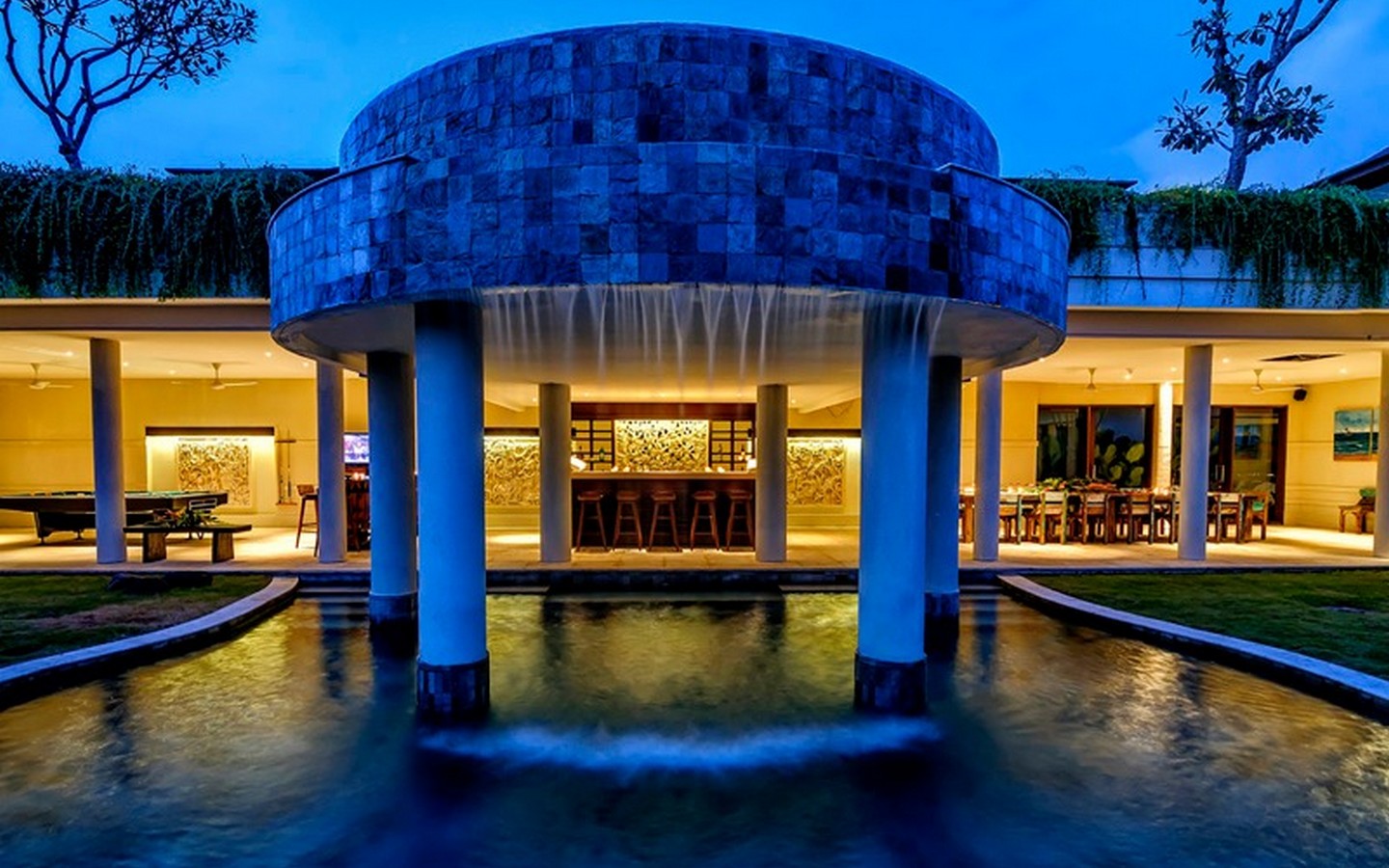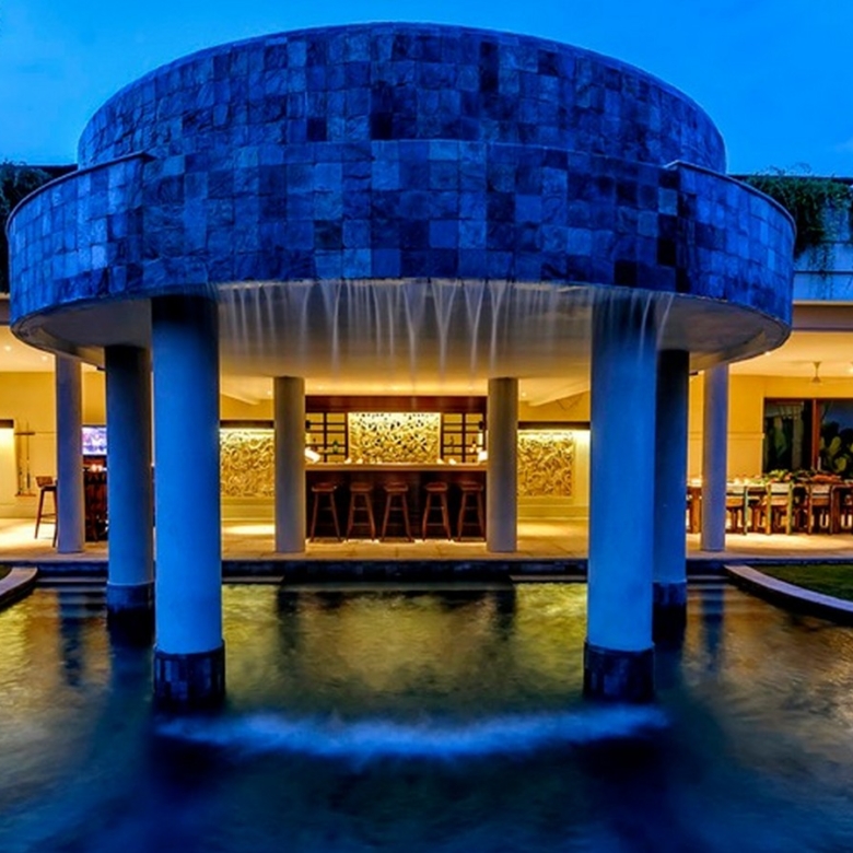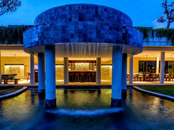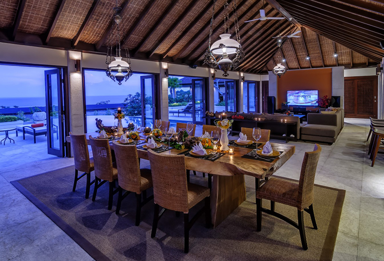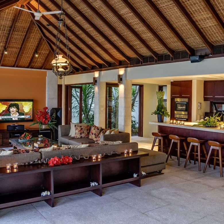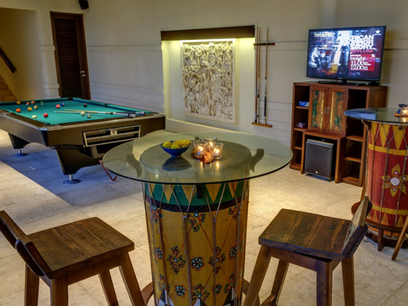 The villa has an elegantly furnished yet comfortable living room and a dining table long enough for 12. The kitchen is modern and fully equipped and also includes a wet kitchen. On the lower level of the villa, an entire space is dedicated to entertaining where you can find a pool table, service bar and another long dining table all facing the pool with water cascading from the main one on top. There is also a garden gazebo nestled within the lush garden. Staff quarters include a kitchen, office, storage rooms and a bedroom with its own bathroom. The villa has a 2-car enclosed garage and comes fully furnished.