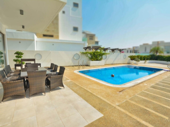 This stunning 5-bedroom villa offers the perfect blend of luxury and comfort. Nestled in a serene neighborhood, the villa boasts spacious living areas and modern amenities. Each bedroom is designed for relaxation, featuring en-suite bathrooms and plush furnishings. The open-plan kitchen and dining area are perfect for entertaining, while the expansive outdoor space includes a private pool, barbeque and a patio with breathtaking views of the Mediterranean Sea. Enjoy the best of Cyprus living in this exquisite villa, just minutes away from pristine beaches and vibrant local attractions.