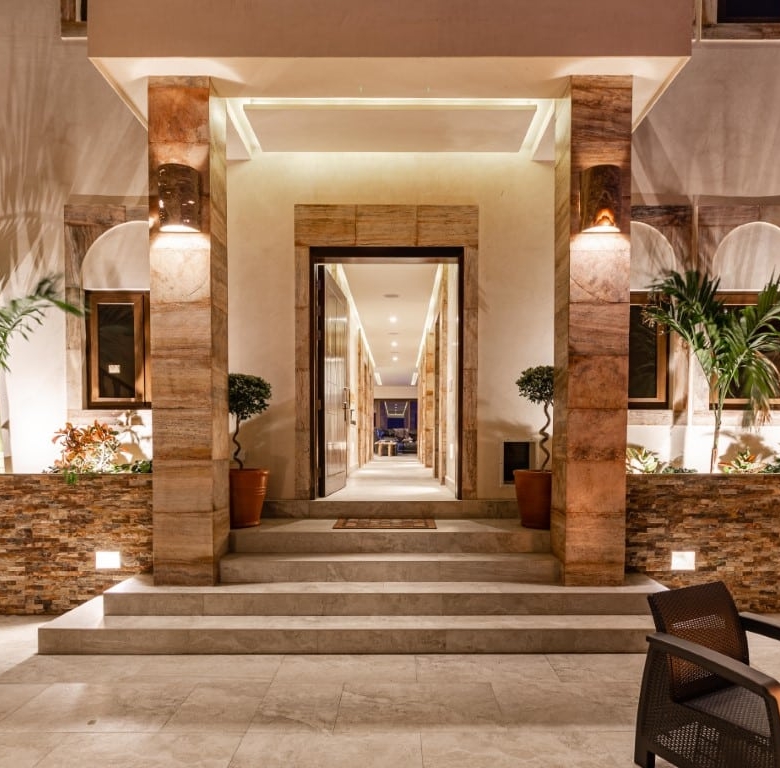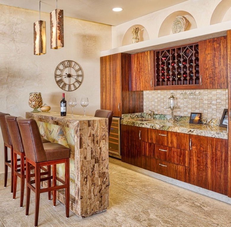 An independent casita provides additional living space, complete with a cozy kitchenette, a bedroom, and a bathroom, making it ideal for guests or staff. The villa’s great room flows effortlessly into a chef’s kitchen, equipped with top-of-the-line appliances and a secure double pantry, catering to even the most elaborate culinary endeavors. A large adjoining laundry room enhances the home’s functionality, while a dedicated office and gymnasium provide the perfect spaces for work and wellness.