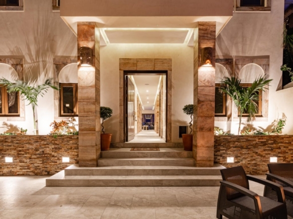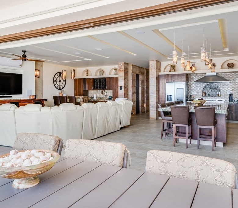 The villa’s outdoor spaces are nothing short of extraordinary. A private beach area, expansive swimming pool, hot tub, courtyard, and fire pit offer endless opportunities for relaxation and entertainment. Whether hosting a lively gathering or enjoying a serene evening, the outdoor amenities provide the ultimate setting for luxurious living. Built with durable concrete construction, the property includes a solar-powered automatic generator for seamless power backup, ensuring comfort and peace of mind at all times.