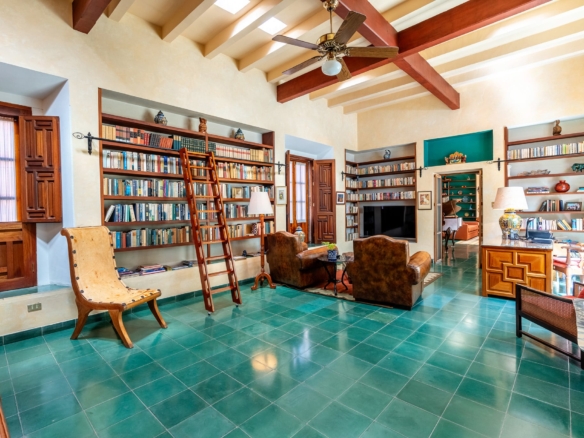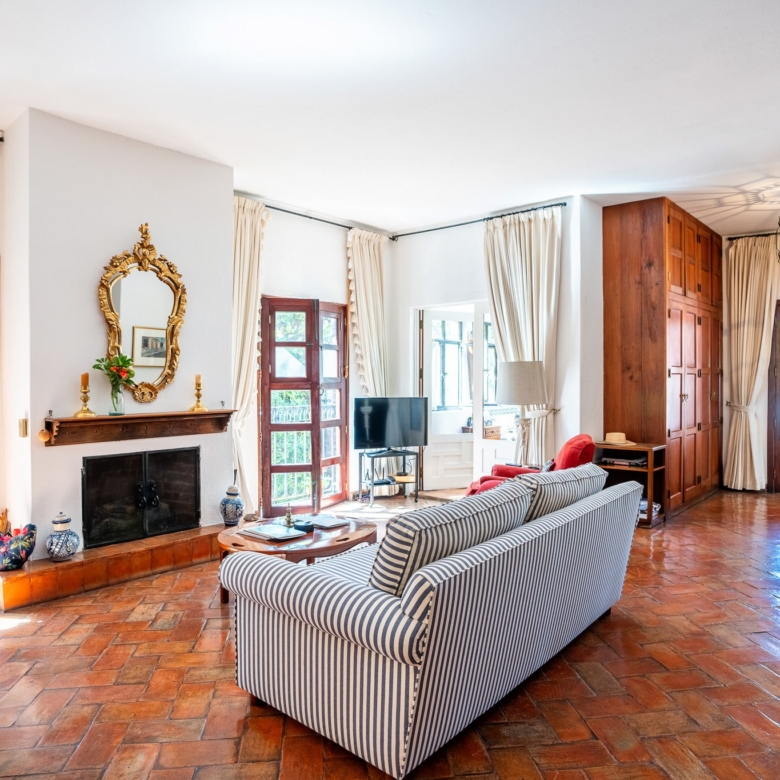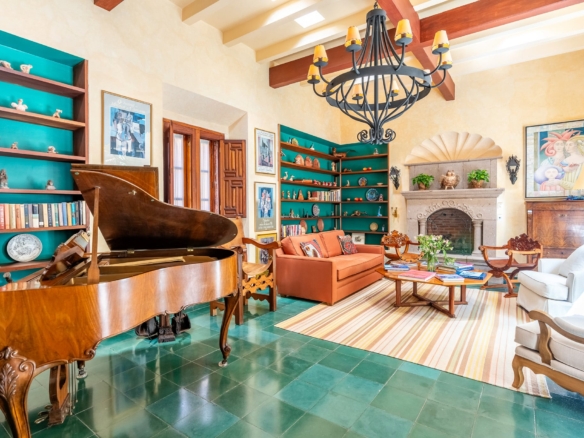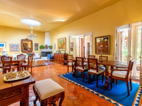 Built on an oversized 613 m² lot, Casa Carolina features two expansive courtyards—one designed as a lush garden retreat, the other ideal for entertaining with an outdoor fireplace and a central fountain. The interiors have been meticulously maintained to preserve historic elements, including boveda ceilings, hand-fired Talavera tile from Dolores Hidalgo, and carved hardwood cabinetry with Moroccan-weave detailing. Multiple cantera stone fireplaces, terra cotta tile floors, and cantera flooring on the terraces further enhance the home’s architectural authenticity.