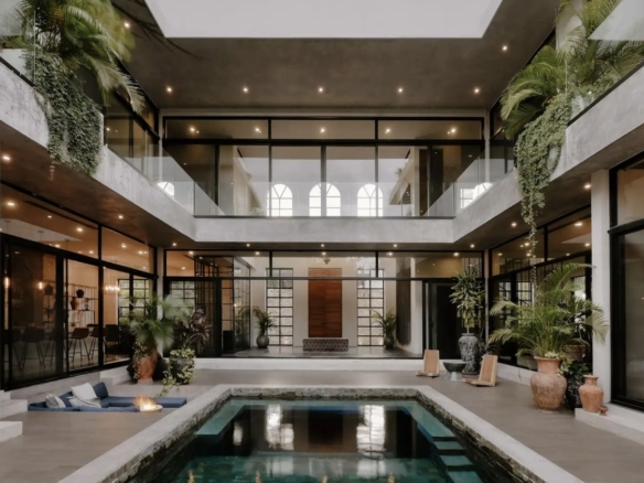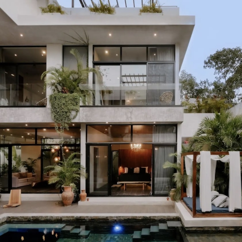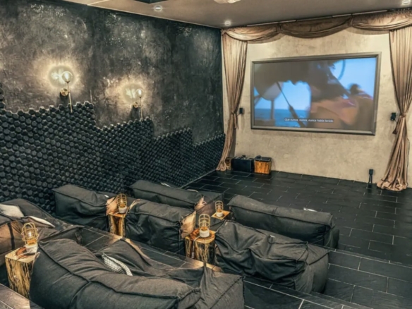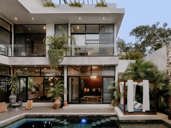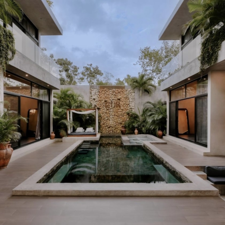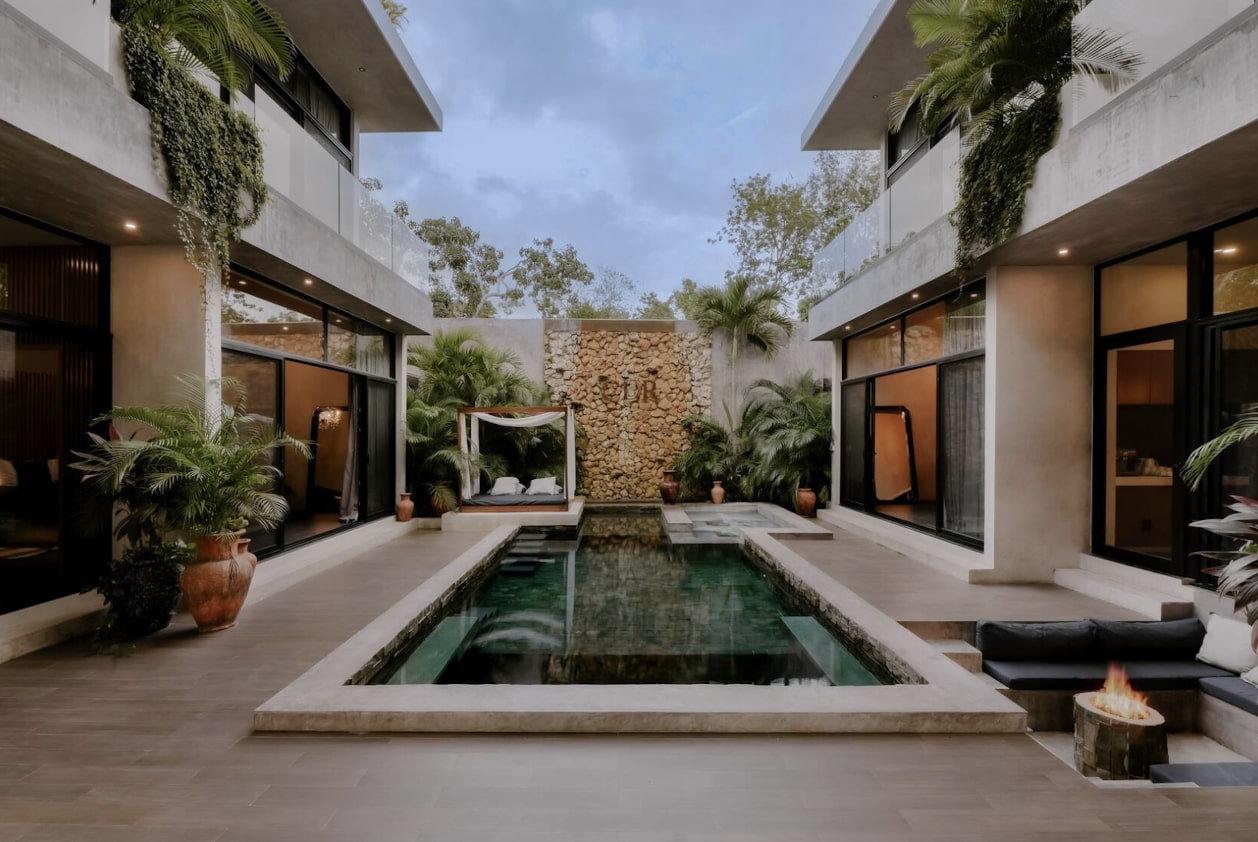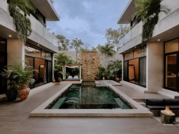 Step into a world of indulgence where seamless indoor-outdoor living is the essence of the design. The residence boasts two spectacular pools—one designed for serene lounging and another for invigorating lap swims—both framed by lush tropical landscaping that mirrors Tulum’s untouched beauty. Two sunken lounges with fire pits create an intimate ambiance under the stars, while the chic cabana lounge and fully equipped bar set the stage for unforgettable social gatherings. For the ultimate entertainment experience, the stadium-style seating area and state-of-the-art private theater offer a cinematic escape in the heart of the jungle.